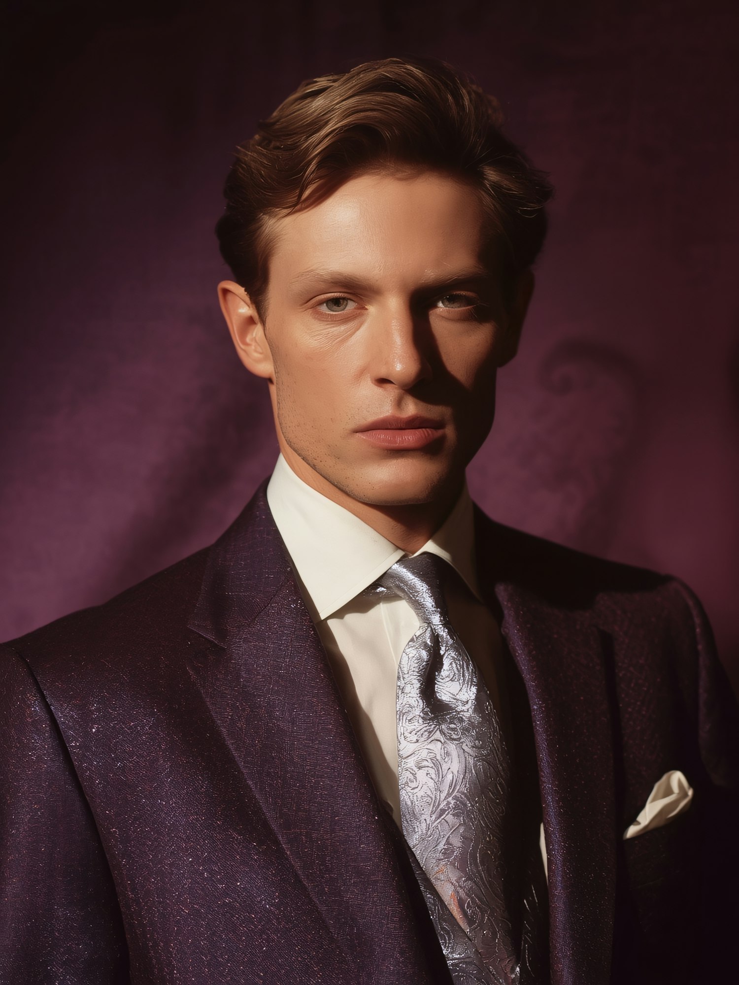 A man in a purple suit and silver tie against a dark purple background, exuding elegance and sophistication.