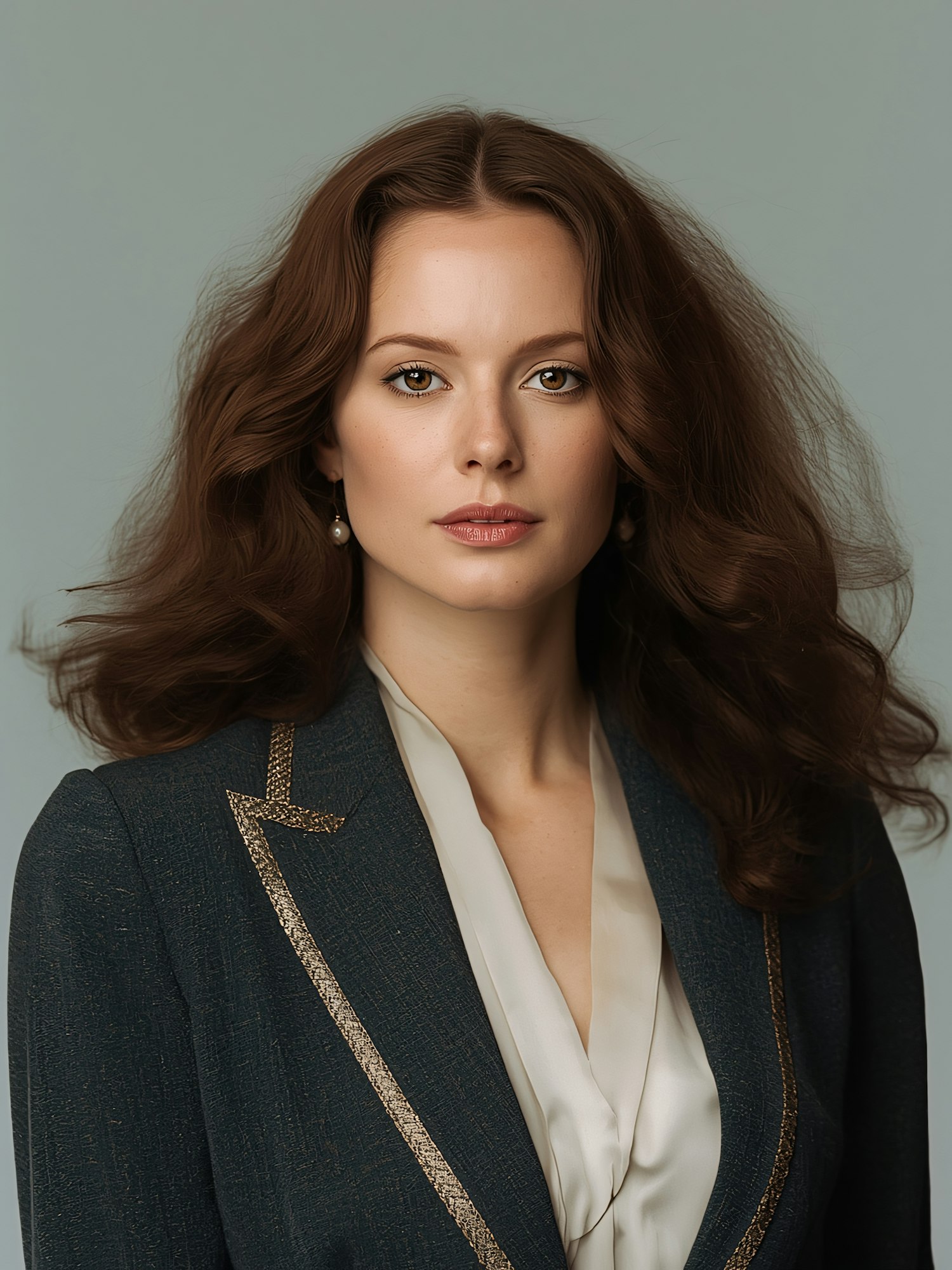 A professional portrait of a woman in a teal blazer with gold accents, set against a muted green background.