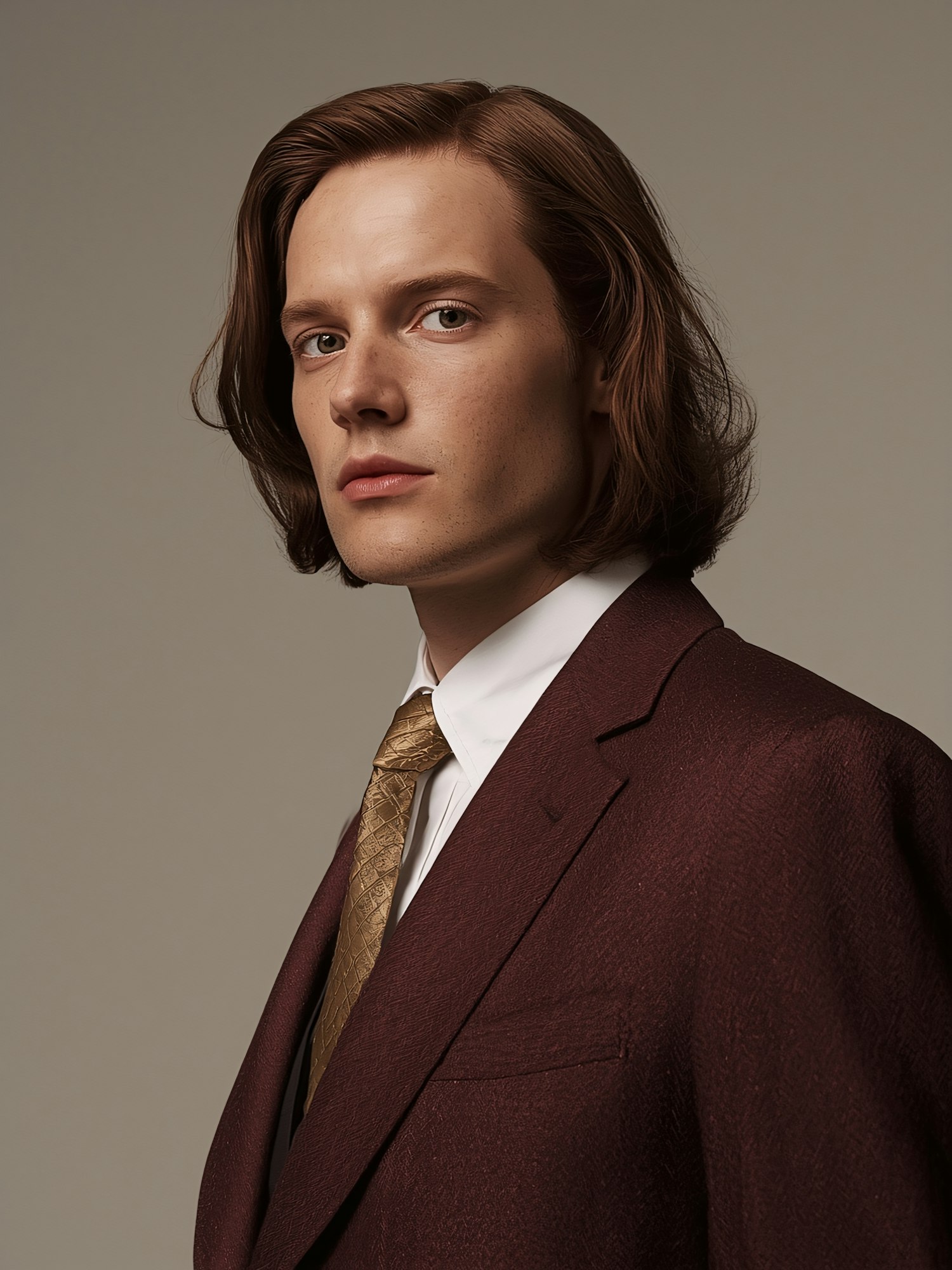A person in a maroon suit and gold tie poses against a neutral background, showcasing a formal and elegant style.