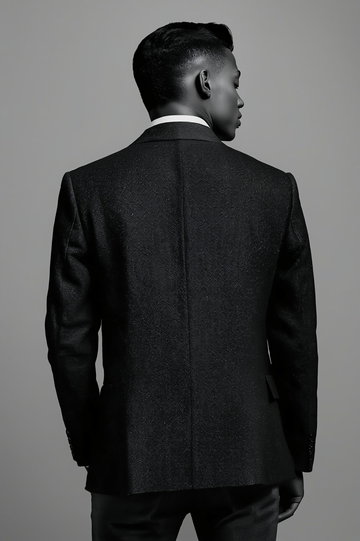 A person in a black textured suit jacket, viewed from behind, against a neutral gray background, showcasing a formal and polished look.