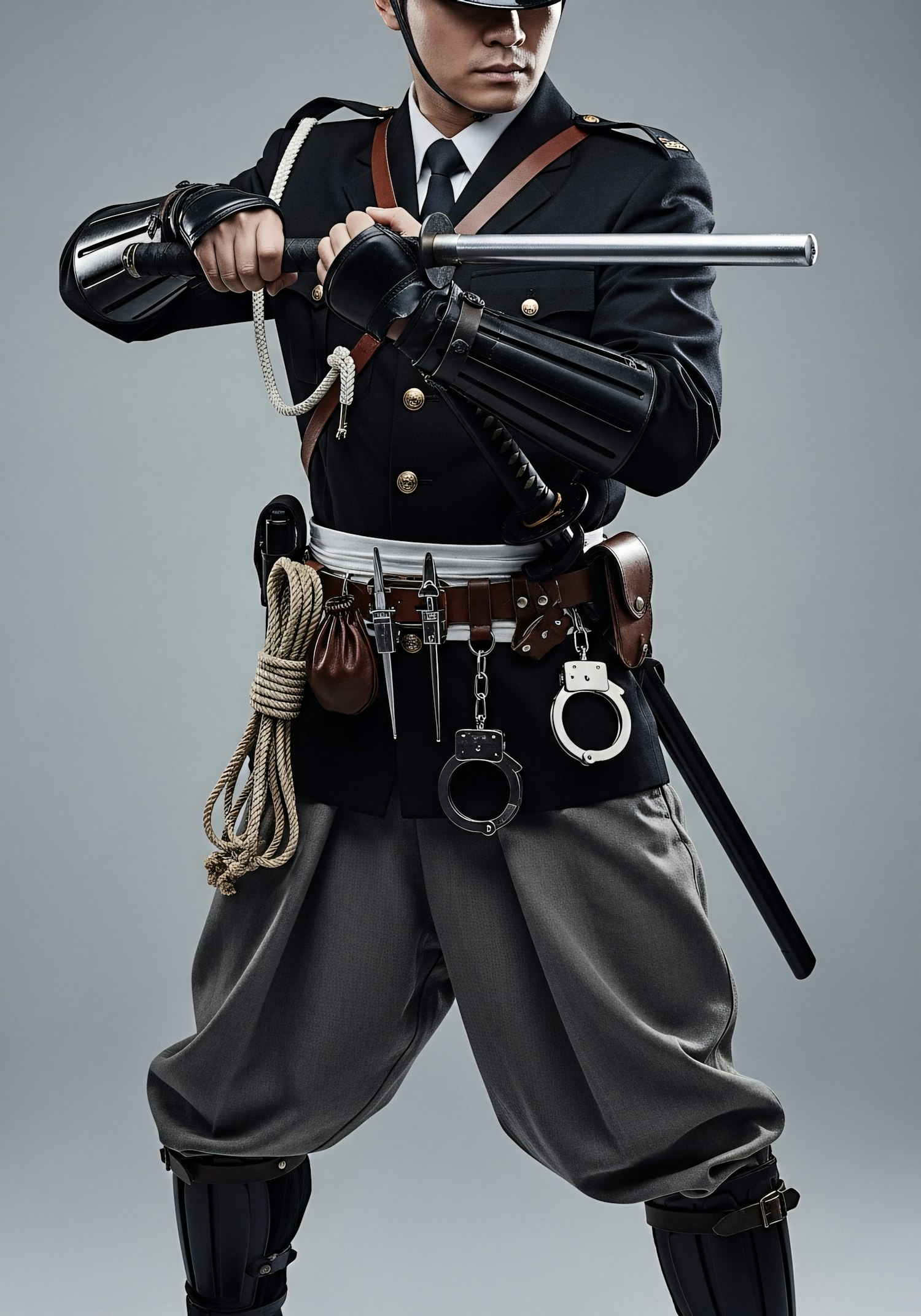 A person in a formal uniform with tools and accessories, holding a baton in a defensive stance against a neutral background.