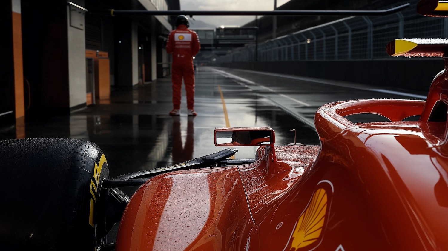 Red Formula 1 car in a rainy pit lane with a racer in red suit, creating a reflective and anticipatory atmosphere.