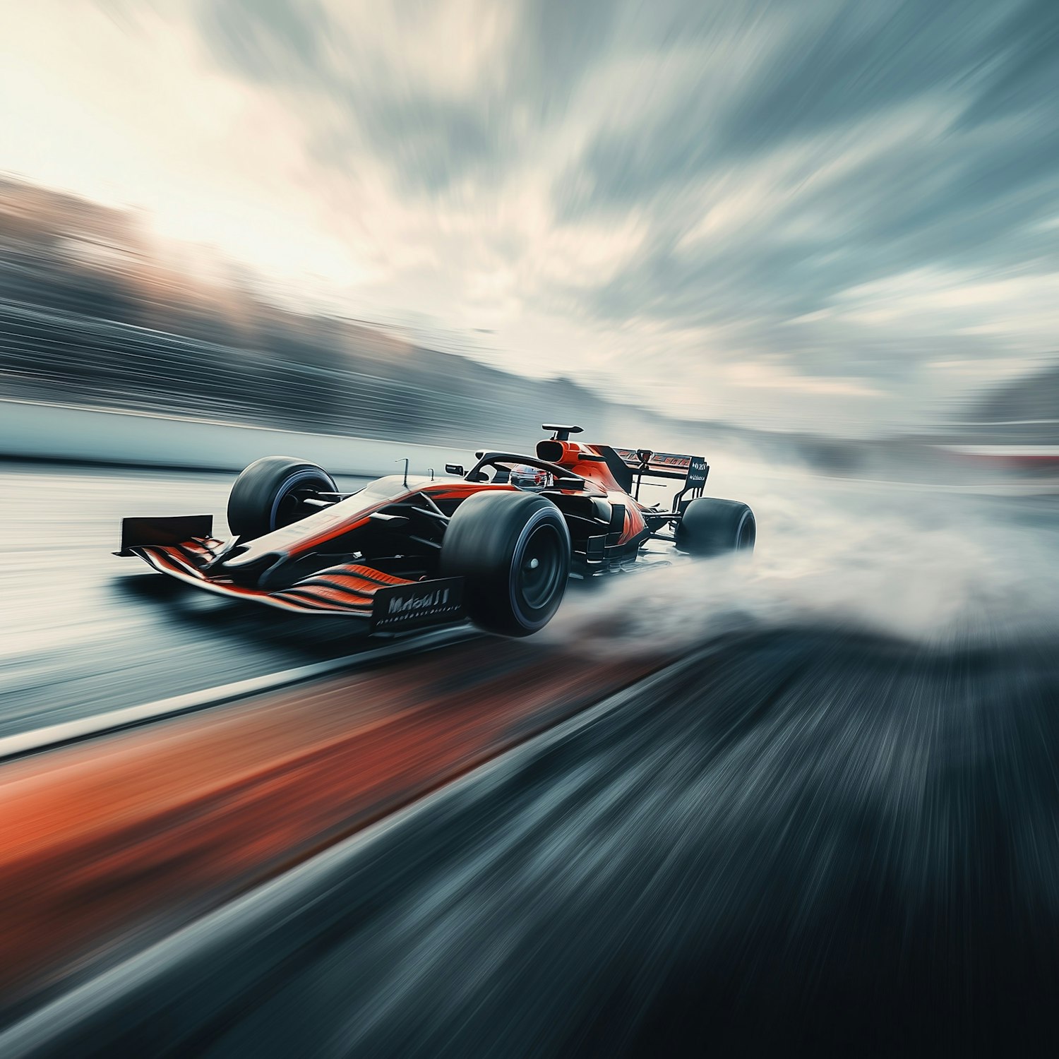 A red and black Formula 1 car racing on a wet track, creating water spray and motion blur for a high-speed, intense motorsport vibe.