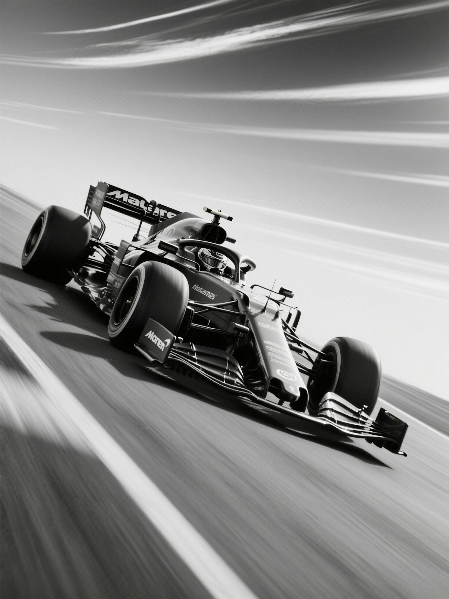 Black and white fine art sports photo of 1 single F1 McLaren 2025 car in motion, dynamic panning shot, blurred background with crisp detail on driver helmet and car nose, high contrast light and shadow, film grain texture, minimalistic composition, timeless editorial motorsport photography --ar 3:2 --v 7 --q 2 --style raw