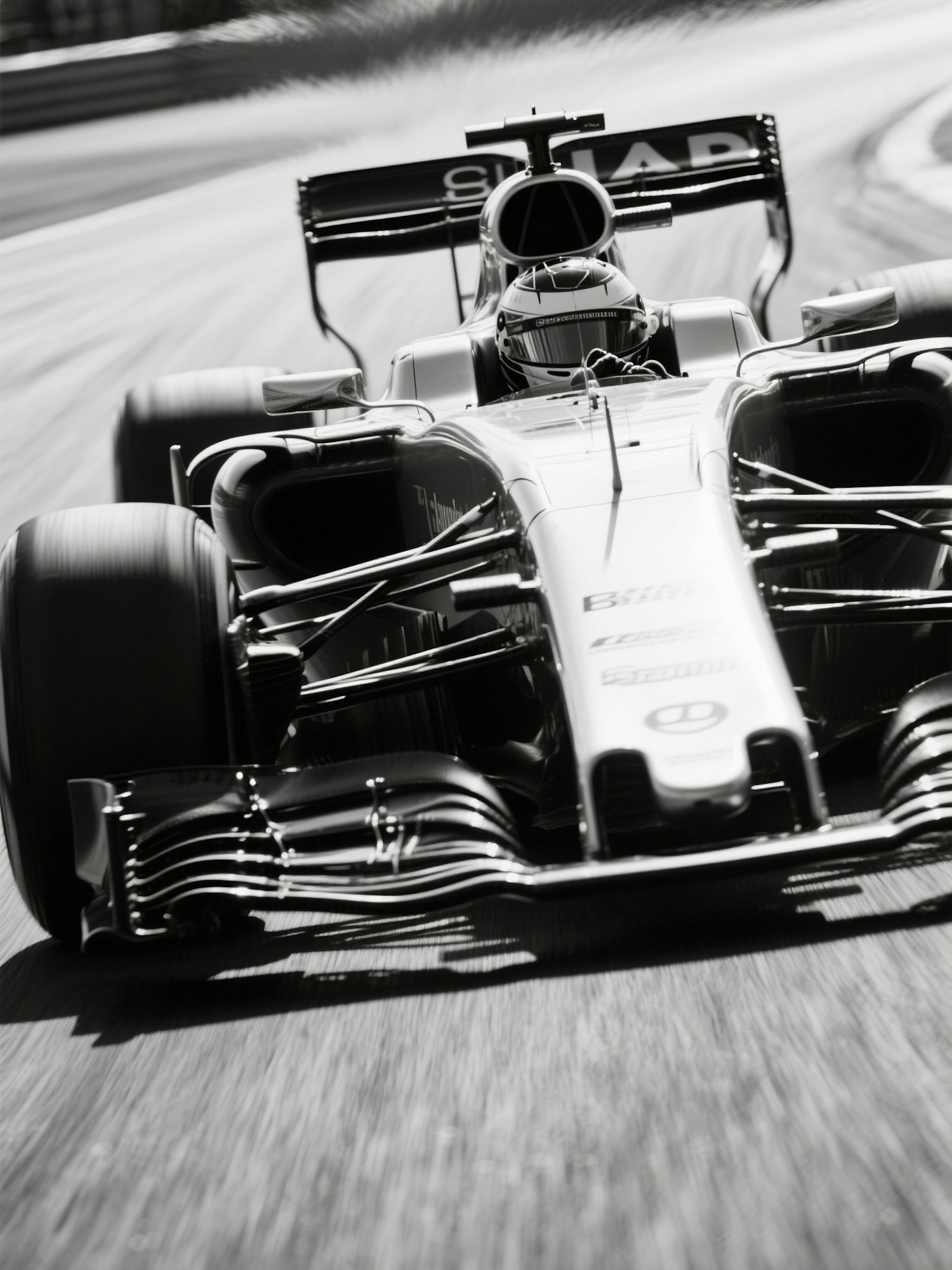 Black and white fine art sports photo of an F1 car in motion, dynamic panning shot, blurred background with crisp detail on driver helmet and car nose, high contrast light and shadow, film grain texture, minimalistic composition, timeless editorial motorsport photography --ar 3:2 --v 7 --q 2 --style raw
