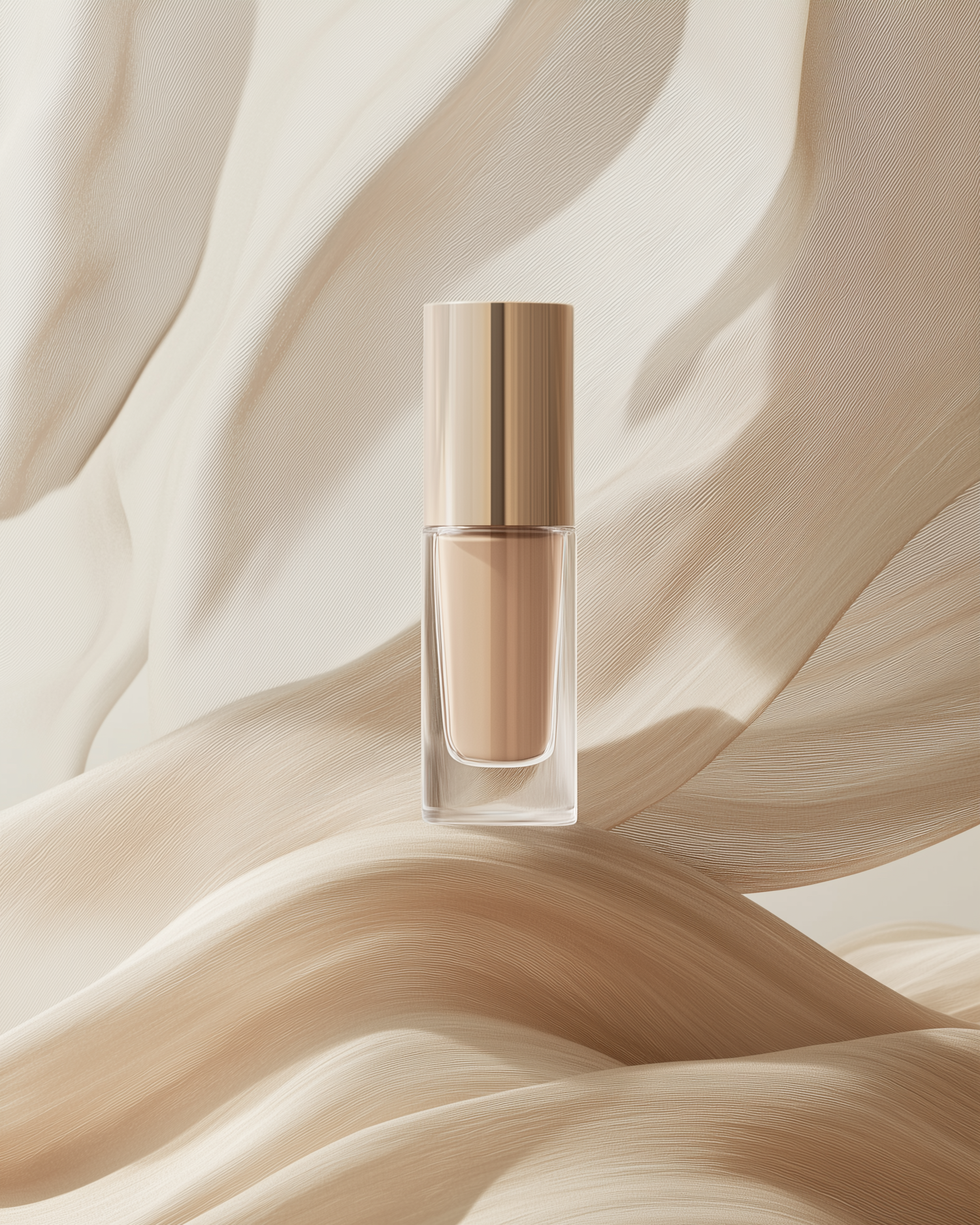 Elegant foundation bottle with gold cap against a flowing beige fabric background, exuding luxury and sophistication.