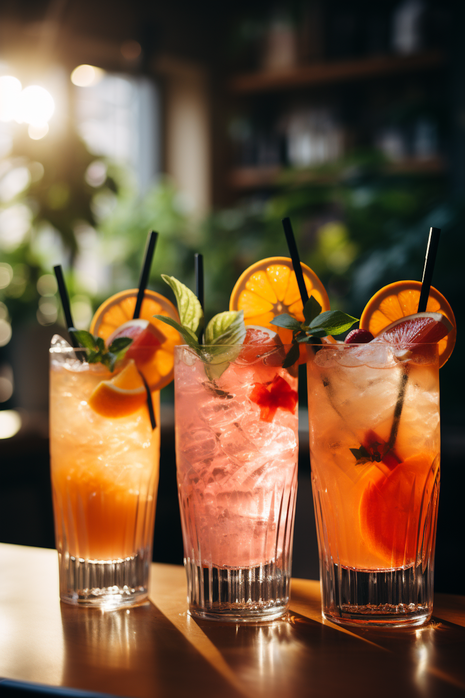 Three vibrant cocktails with orange slices and mint sprigs in tall glasses, bathed in warm sunlight on a wooden table.