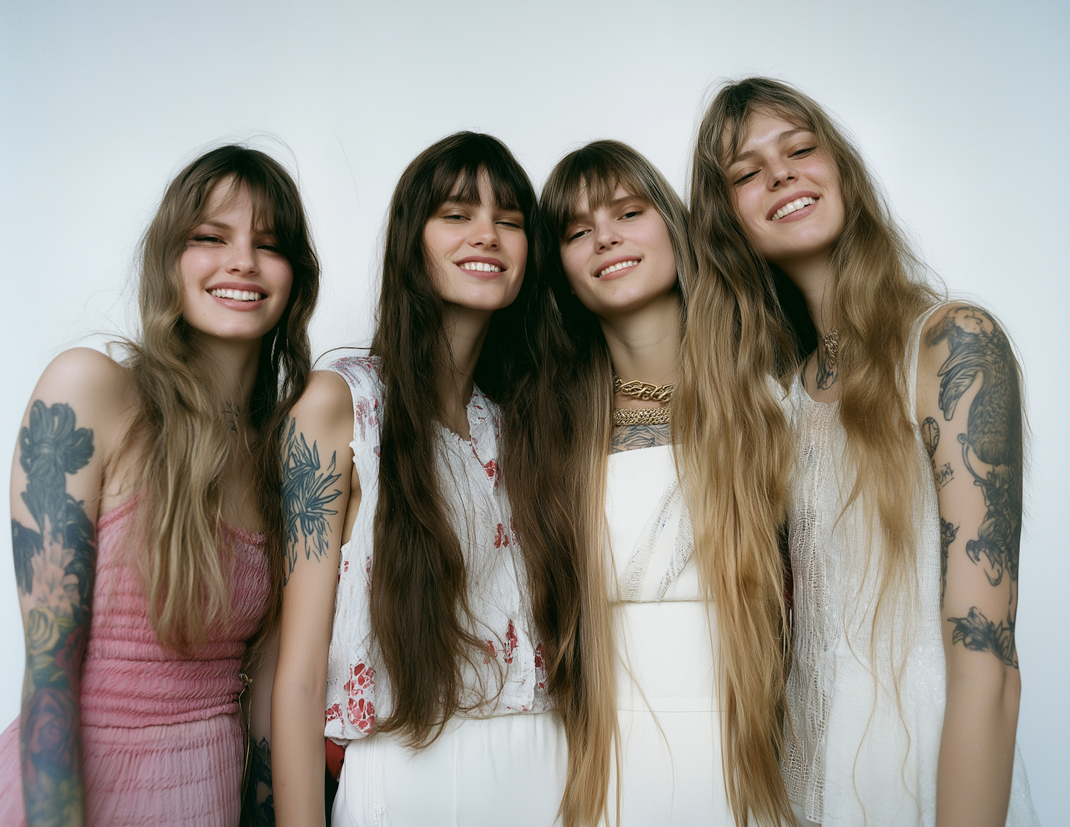 Four young women with long hair and tattoos, smiling together in light summer outfits, exuding joy and friendship.