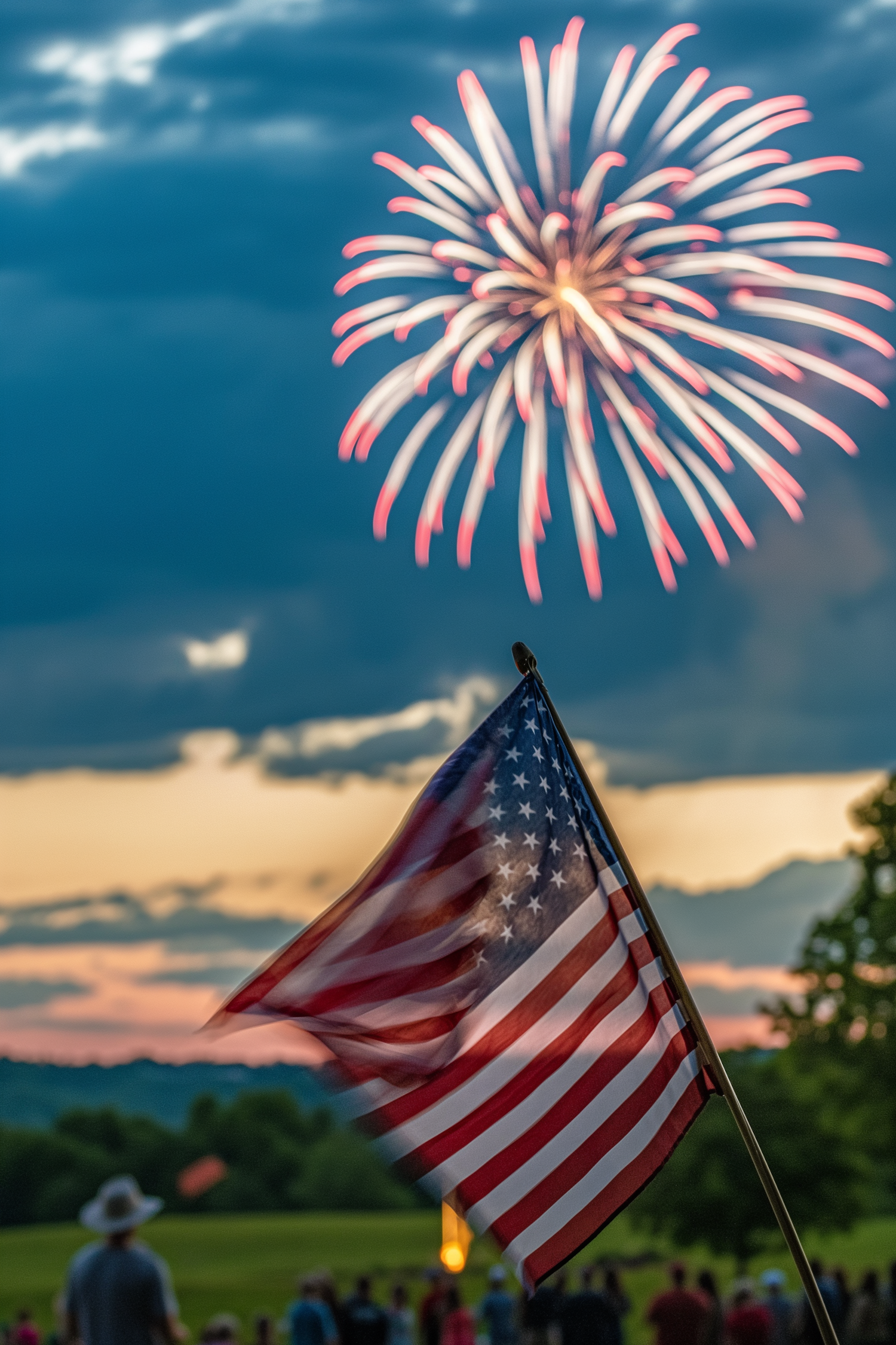 Patriotic fireworks light up the sky with an American flag waving in the foreground, capturing a festive celebration.
