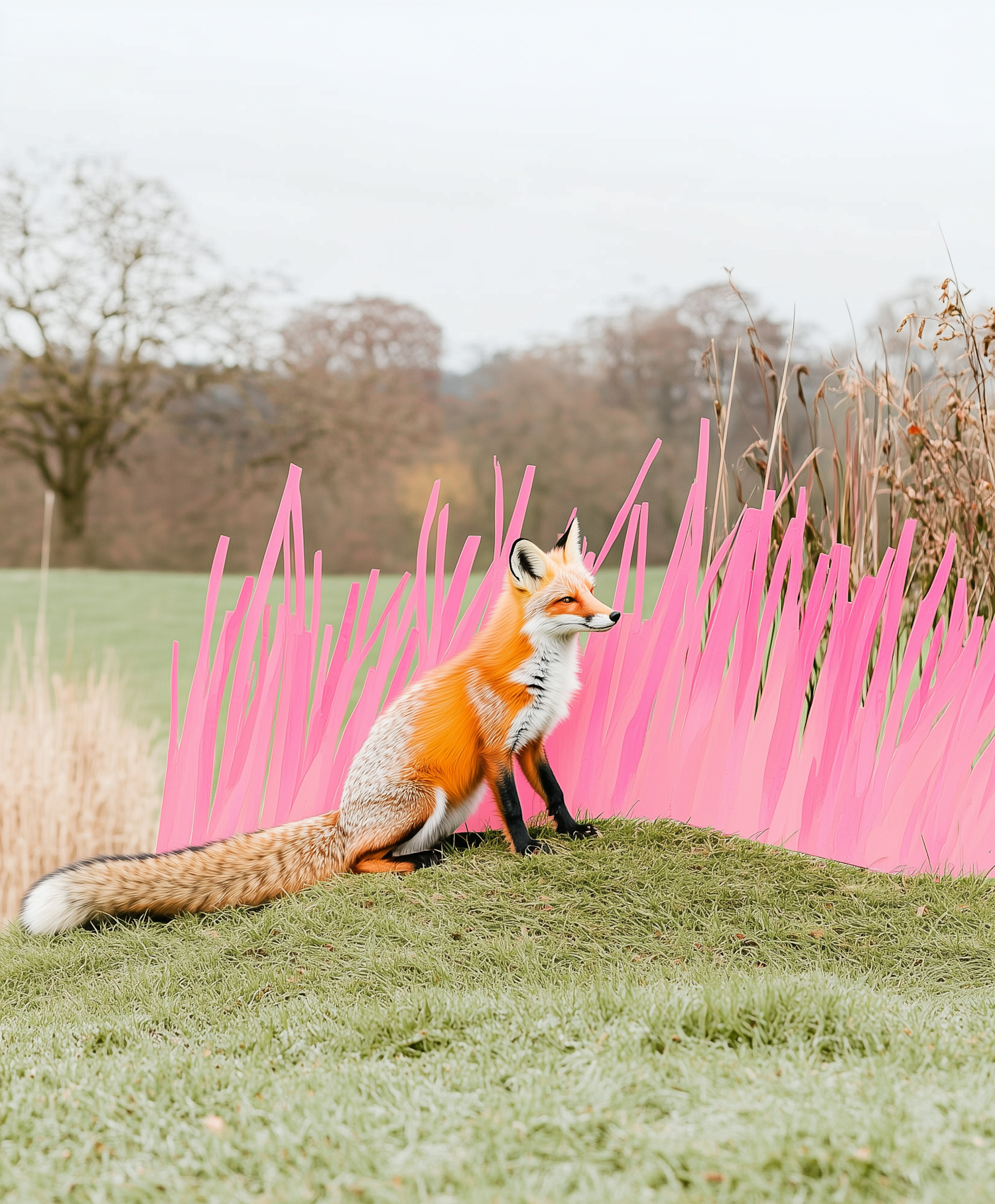 A red fox sits on grass with surreal pink grass around it, creating a whimsical and artistic scene.