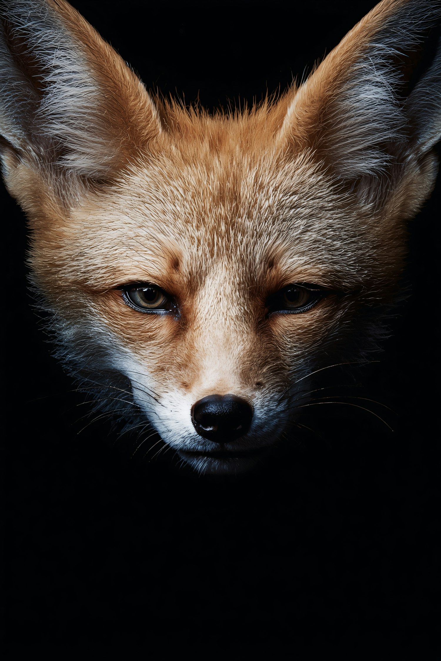 A striking close-up of a fox's face, showcasing its vibrant fur and piercing eyes against a dark background.