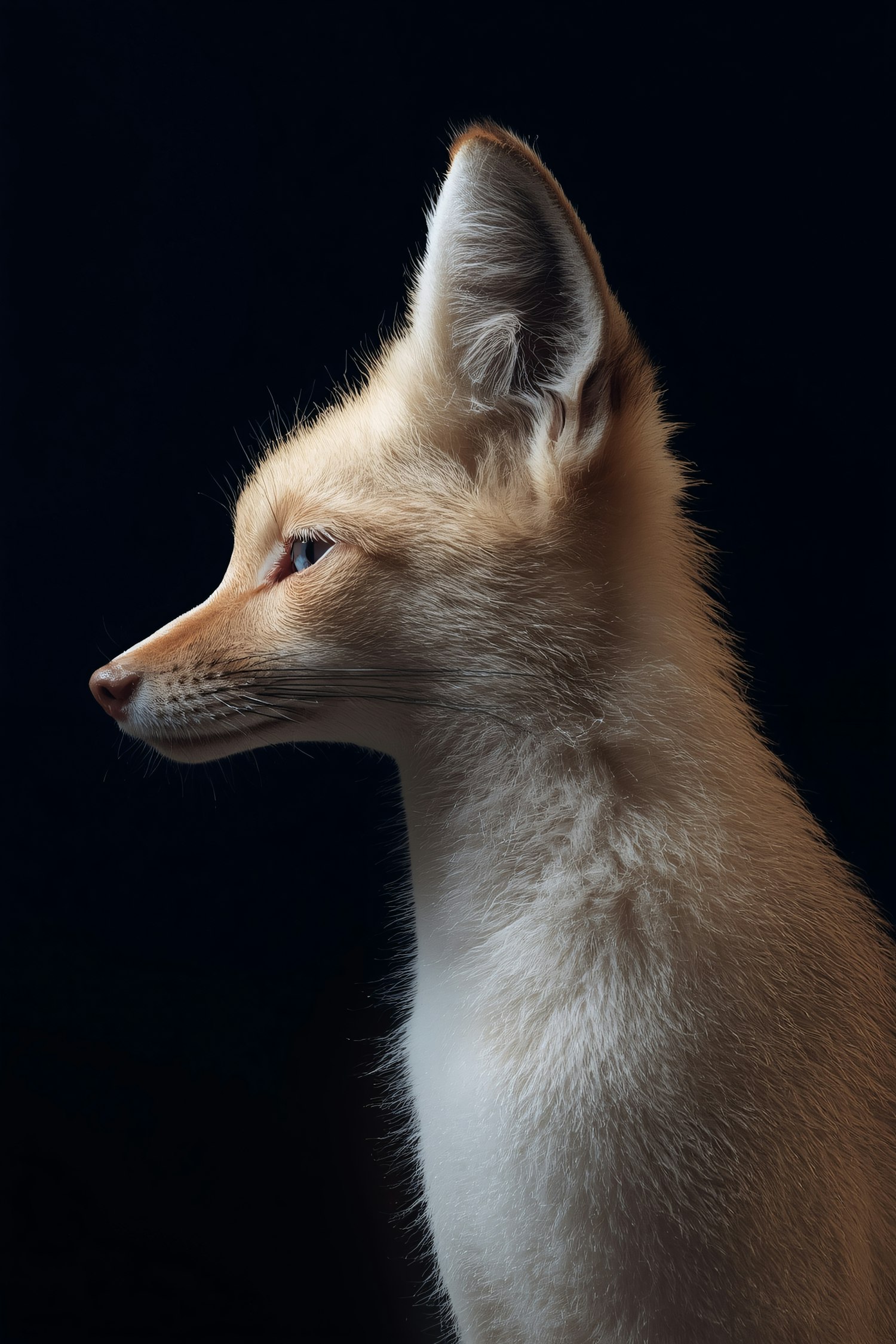 A close-up side profile of a light-colored fox against a dark background, showcasing its soft fur and sharp features.