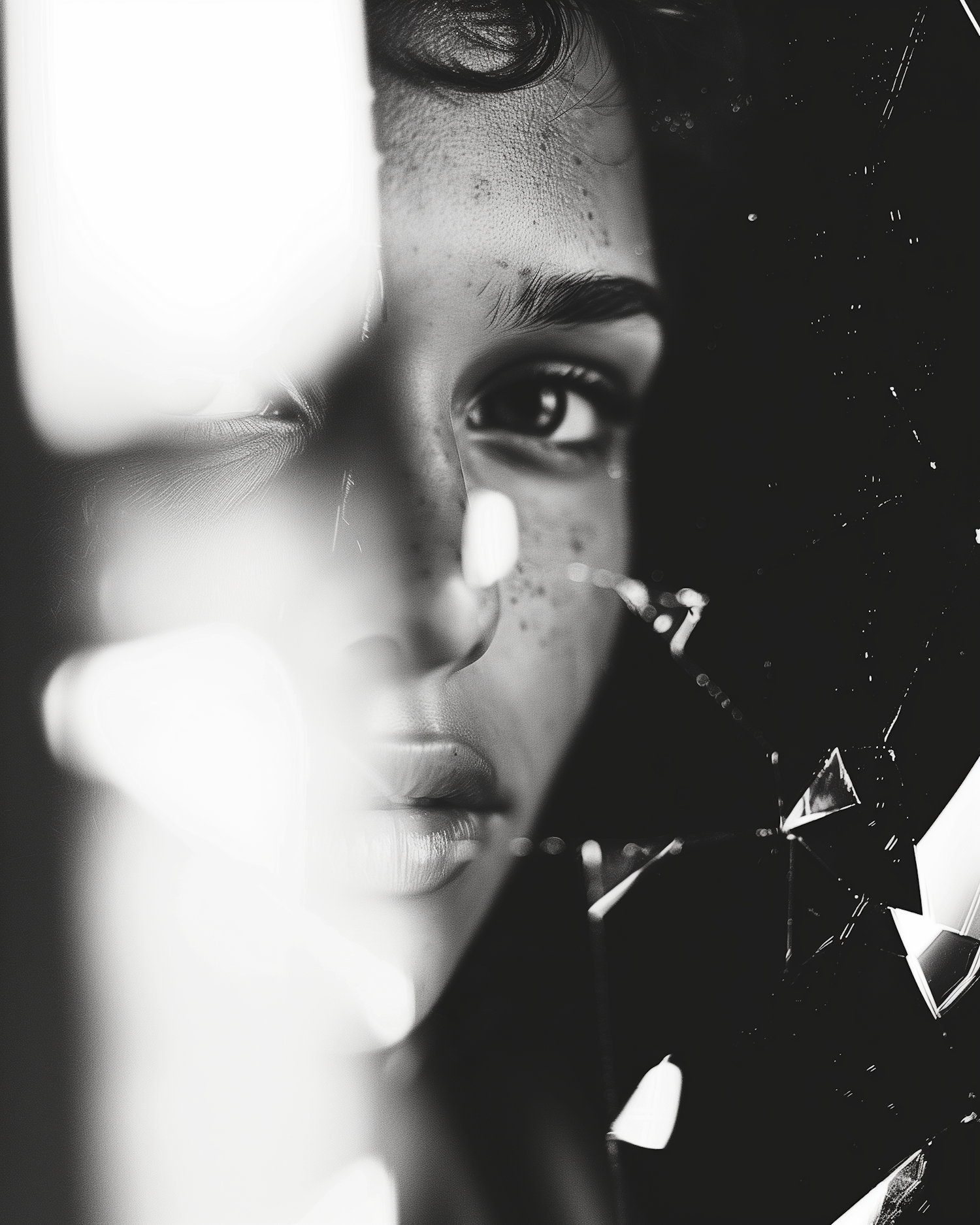 Artistic black and white portrait with fragmented glass effect, highlighting a person's eye and lips in a dramatic composition.