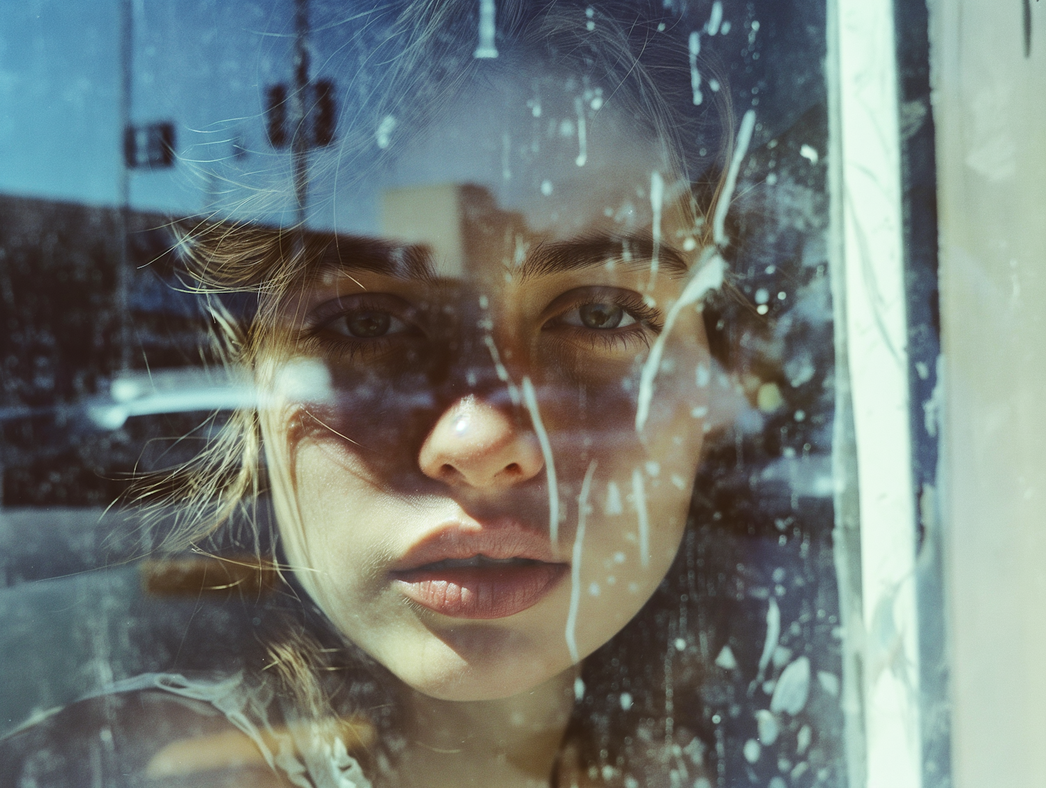 A young woman with light brown hair and blue-green eyes looks through a paint-splattered window, creating an artistic and contemplative scene.
