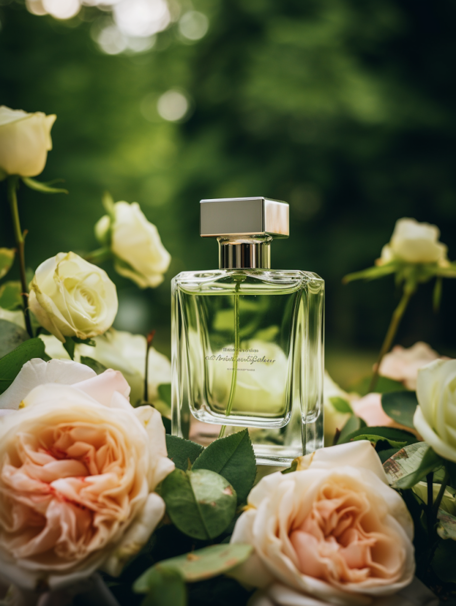 Elegant perfume bottle surrounded by blooming roses, exuding luxury and freshness in a lush green setting.