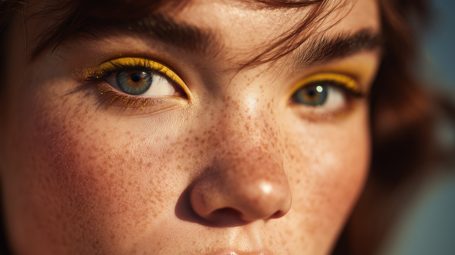 Close-up of a freckled face with vibrant yellow eyeshadow and striking blue-green eyes, showcasing natural beauty and artistic expression.