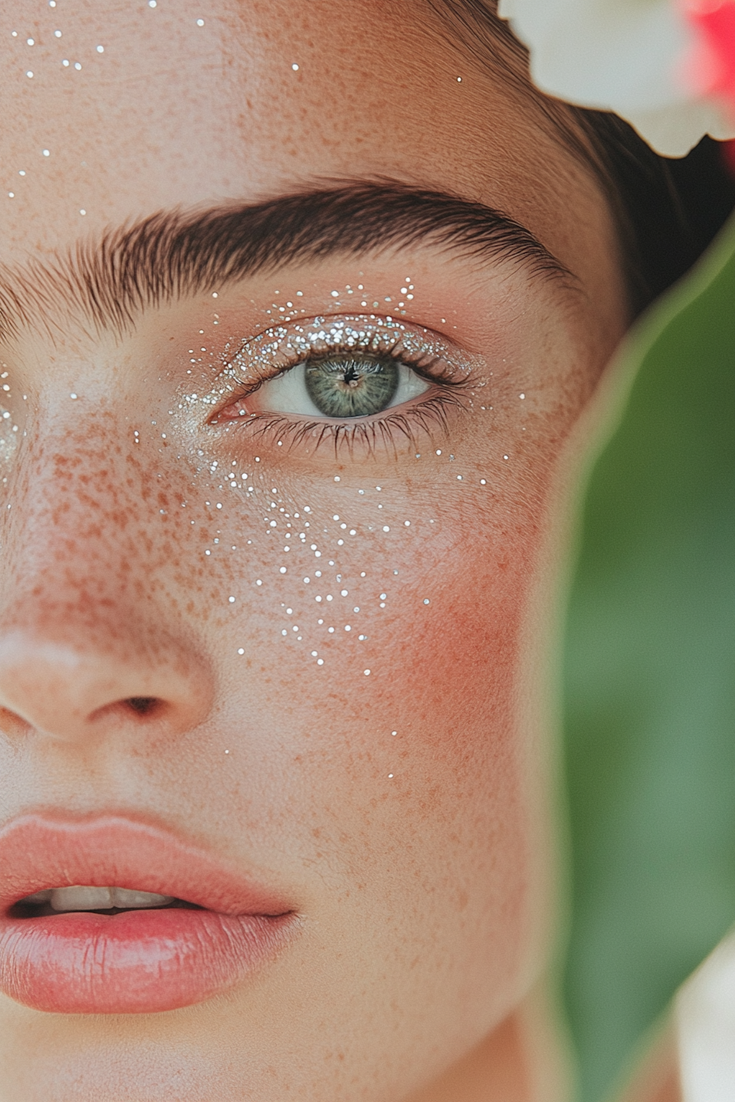 Close-up of a freckled face with glittery eye makeup, green eye, and natural pink lips, framed by a blurred leaf and flower.