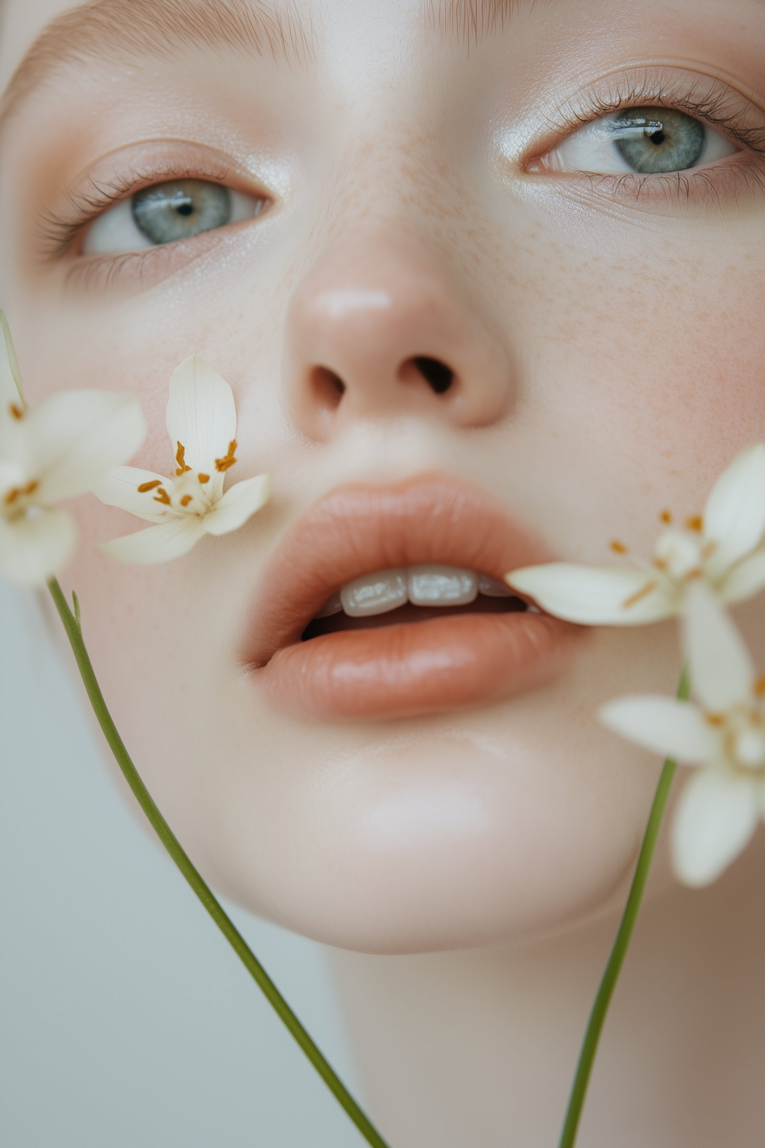 Close-up of a freckled face with blue-green eyes, soft pink lips, and delicate white flowers framing the serene composition.