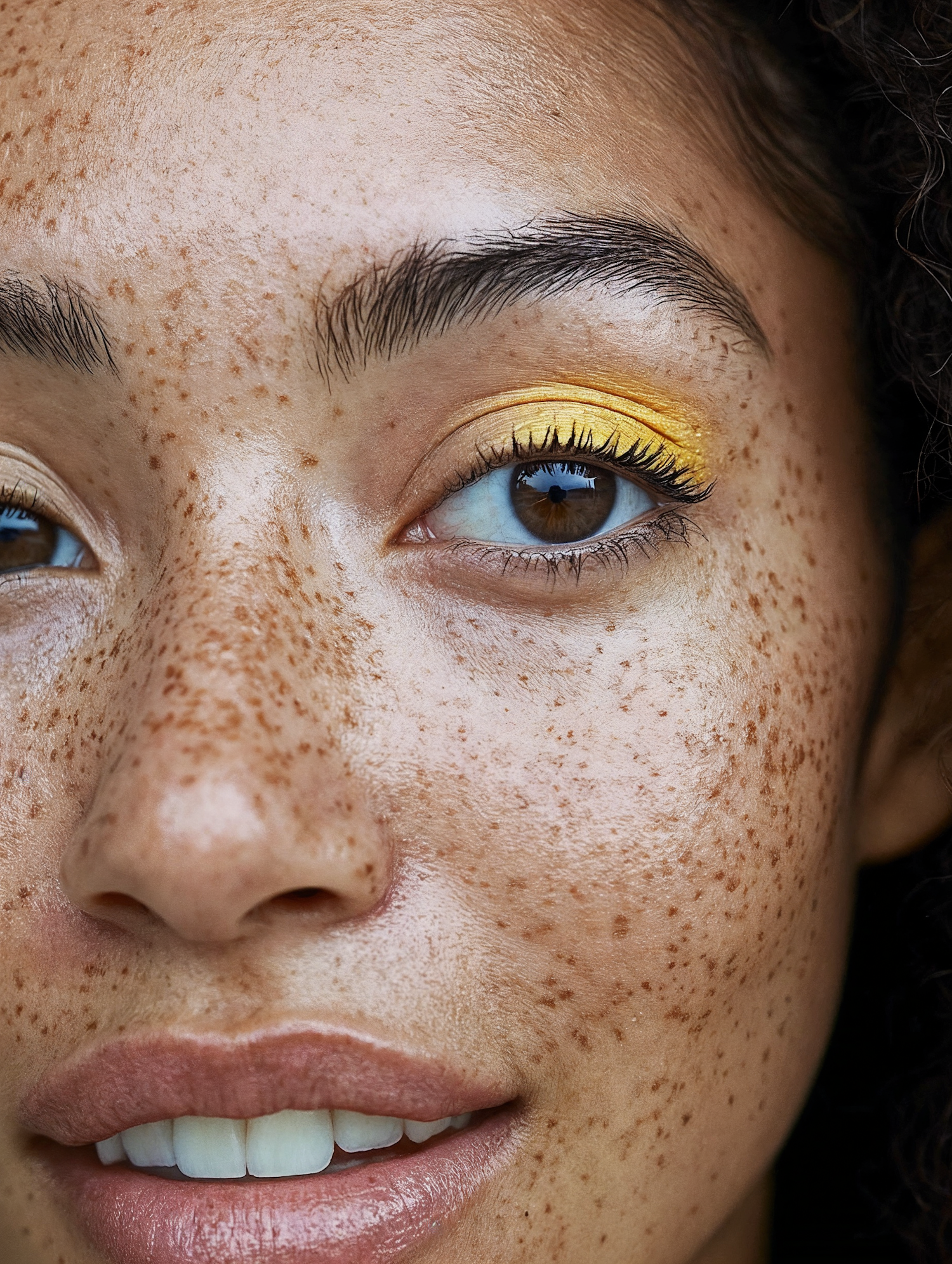 Close-up of a freckled face with vibrant yellow eyeshadow, natural brows, and soft pink lips, showcasing radiant skin and unique beauty.
