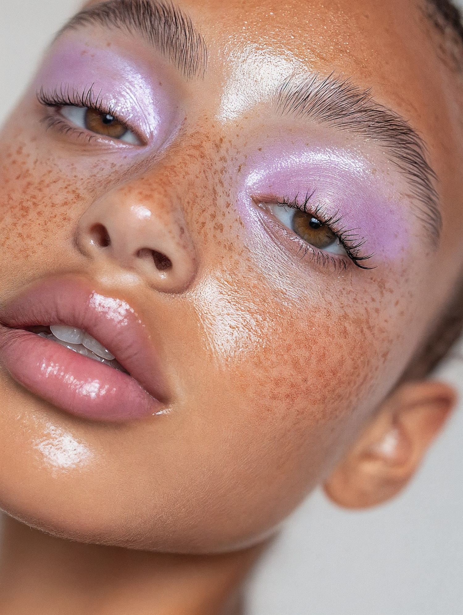 Close-up of a freckled face with glossy lips, lavender eyeshadow, and radiant skin, showcasing a fresh and luminous makeup look.