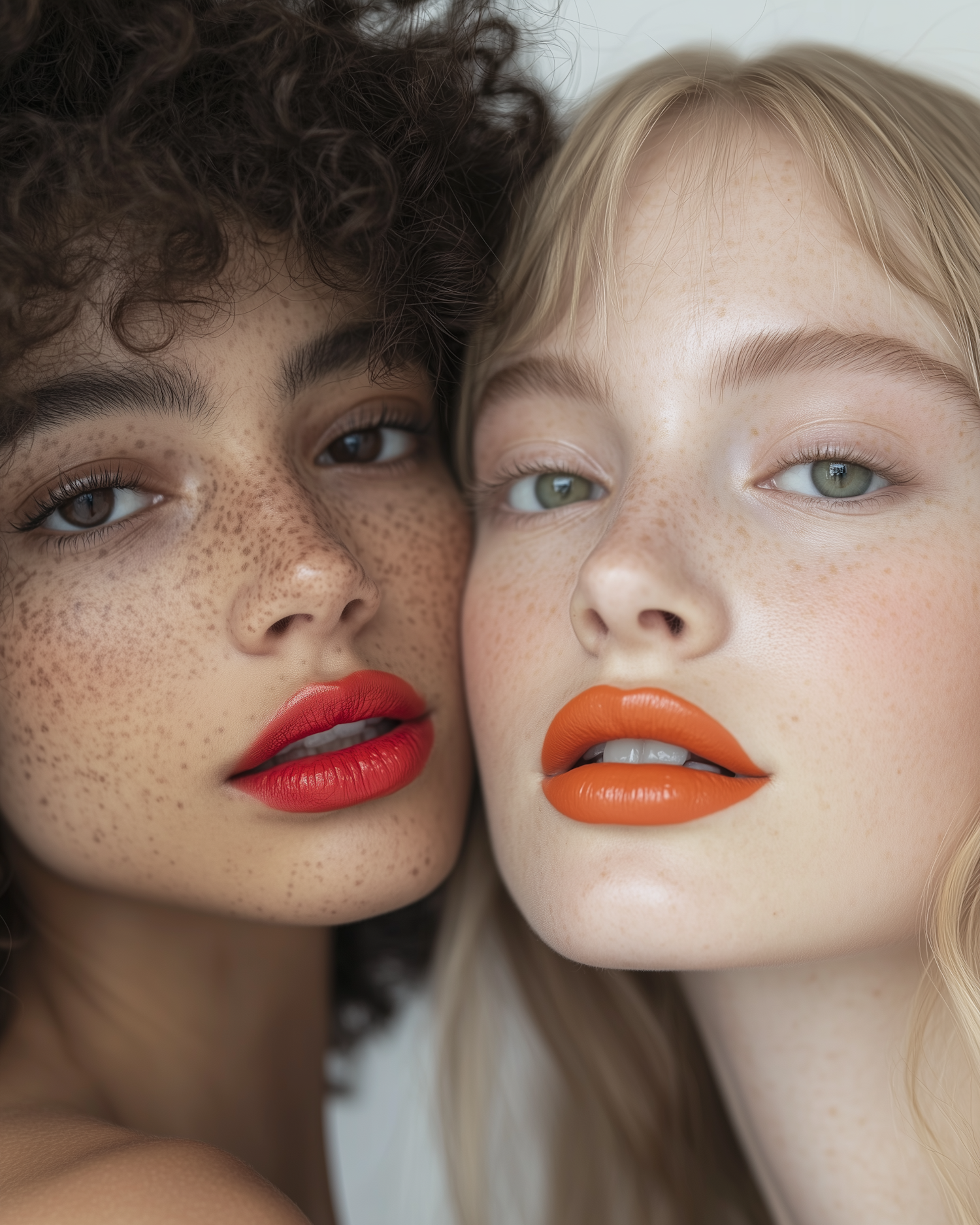 Close-up of two women with freckles, bold red and orange lipstick, and contrasting skin tones, highlighting natural beauty and vibrant makeup.