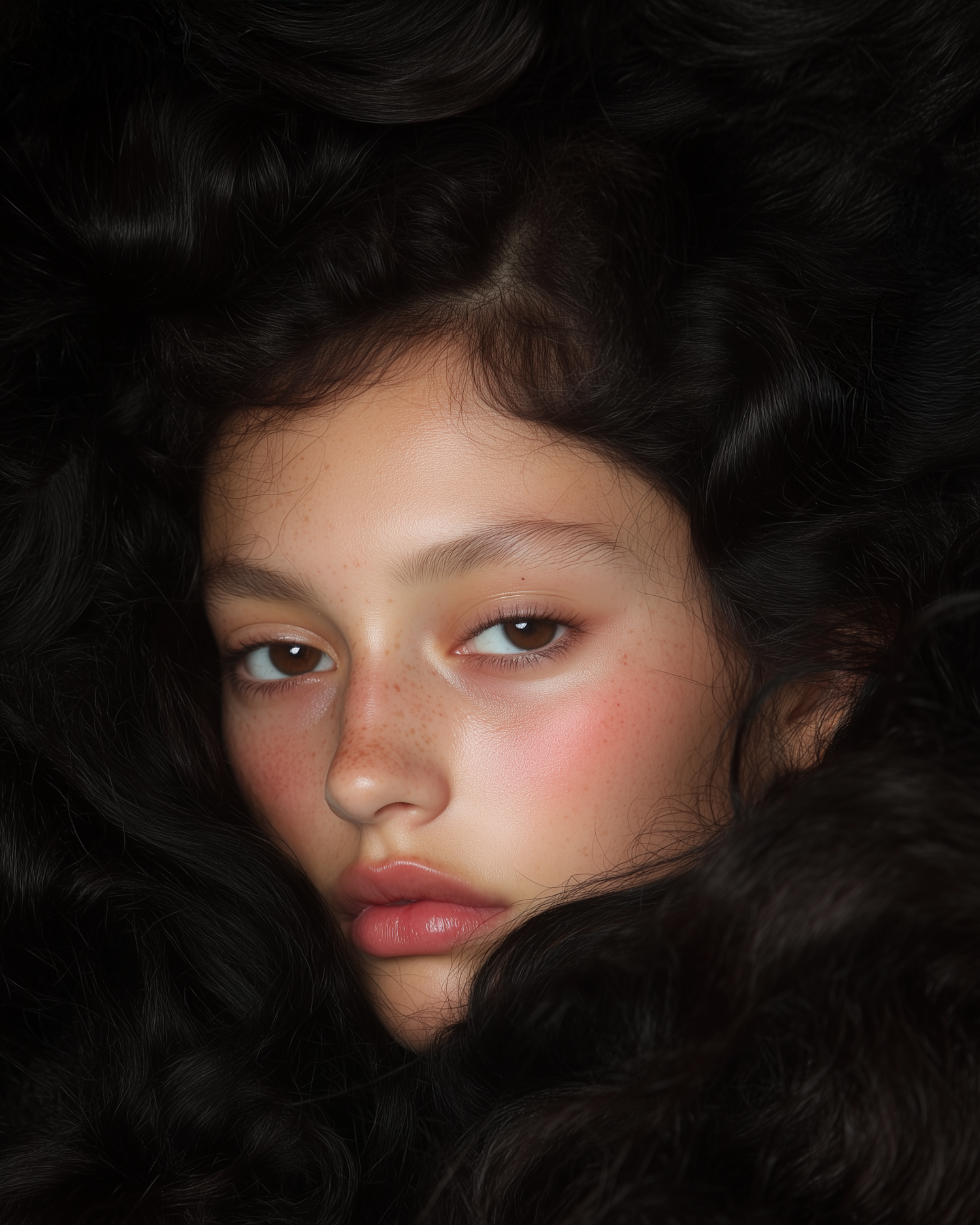 Close-up of a young woman with freckles, wavy black hair, and a calm expression, showcasing natural beauty and soft lighting.