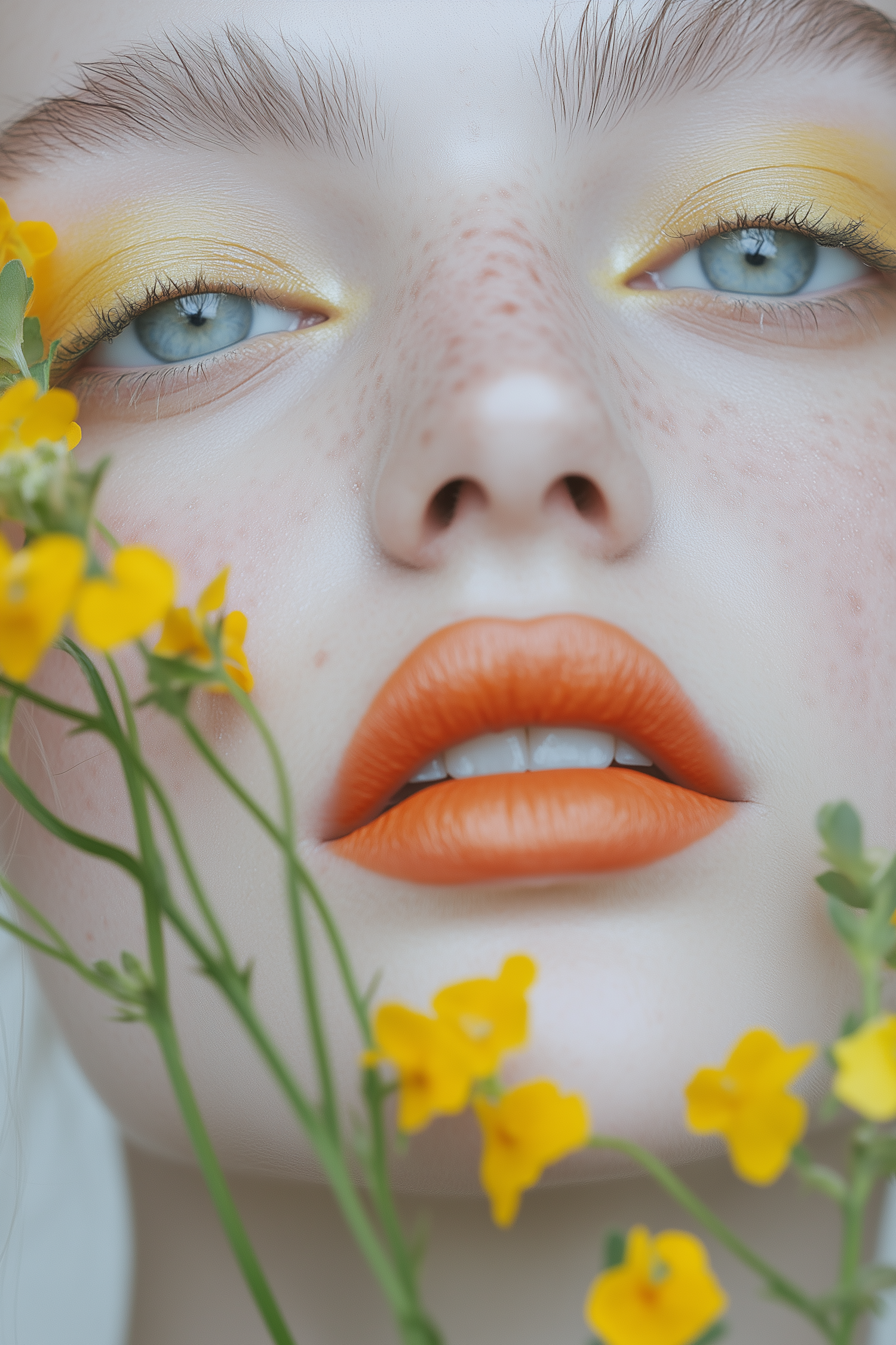 Close-up of a freckled face with bold yellow eyeshadow, orange lips, and yellow flowers, creating a vibrant and artistic aesthetic.