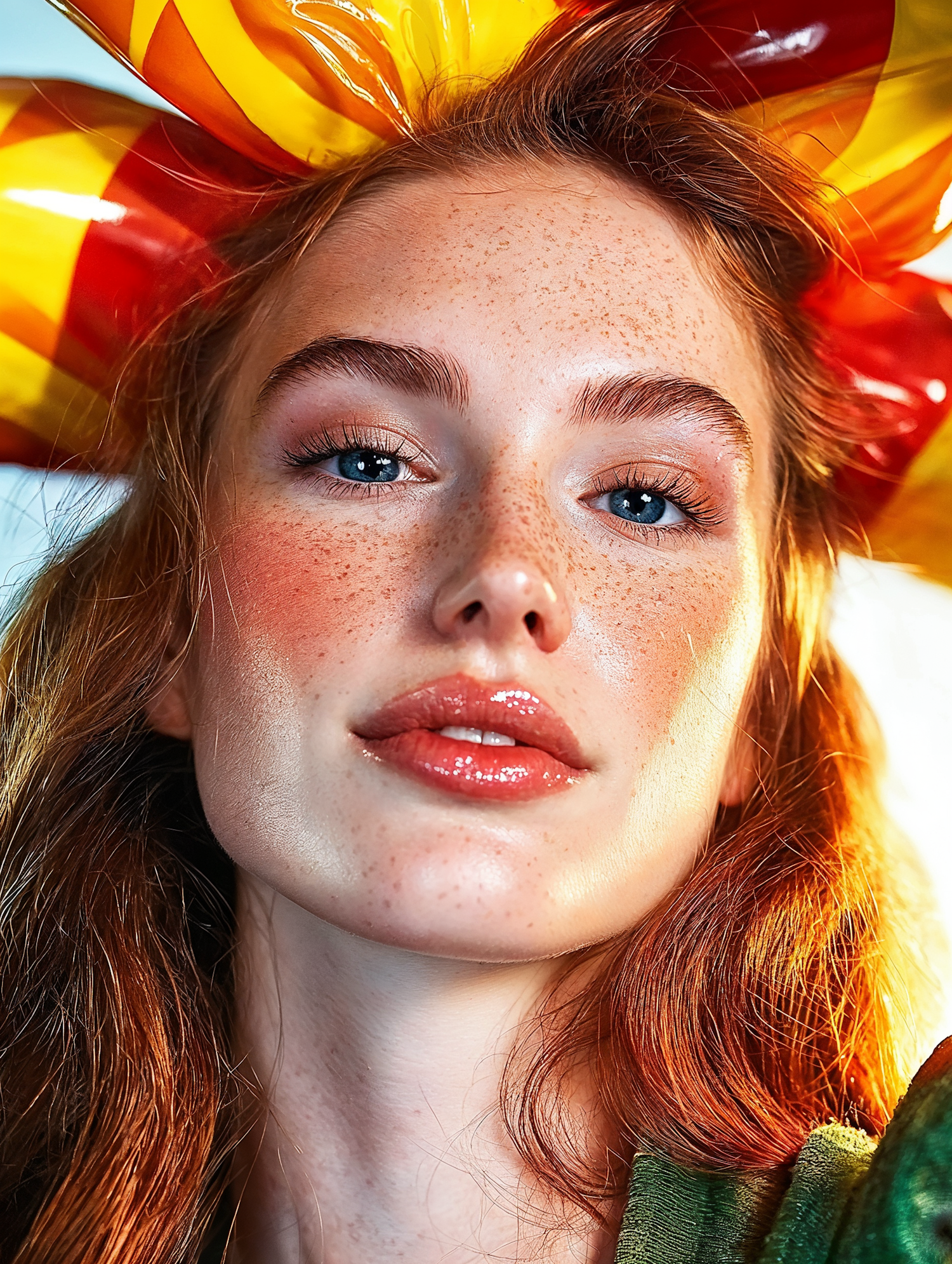Close-up of a freckled woman with red hair, blue eyes, and a vibrant red-yellow flower headpiece, glowing in warm lighting.