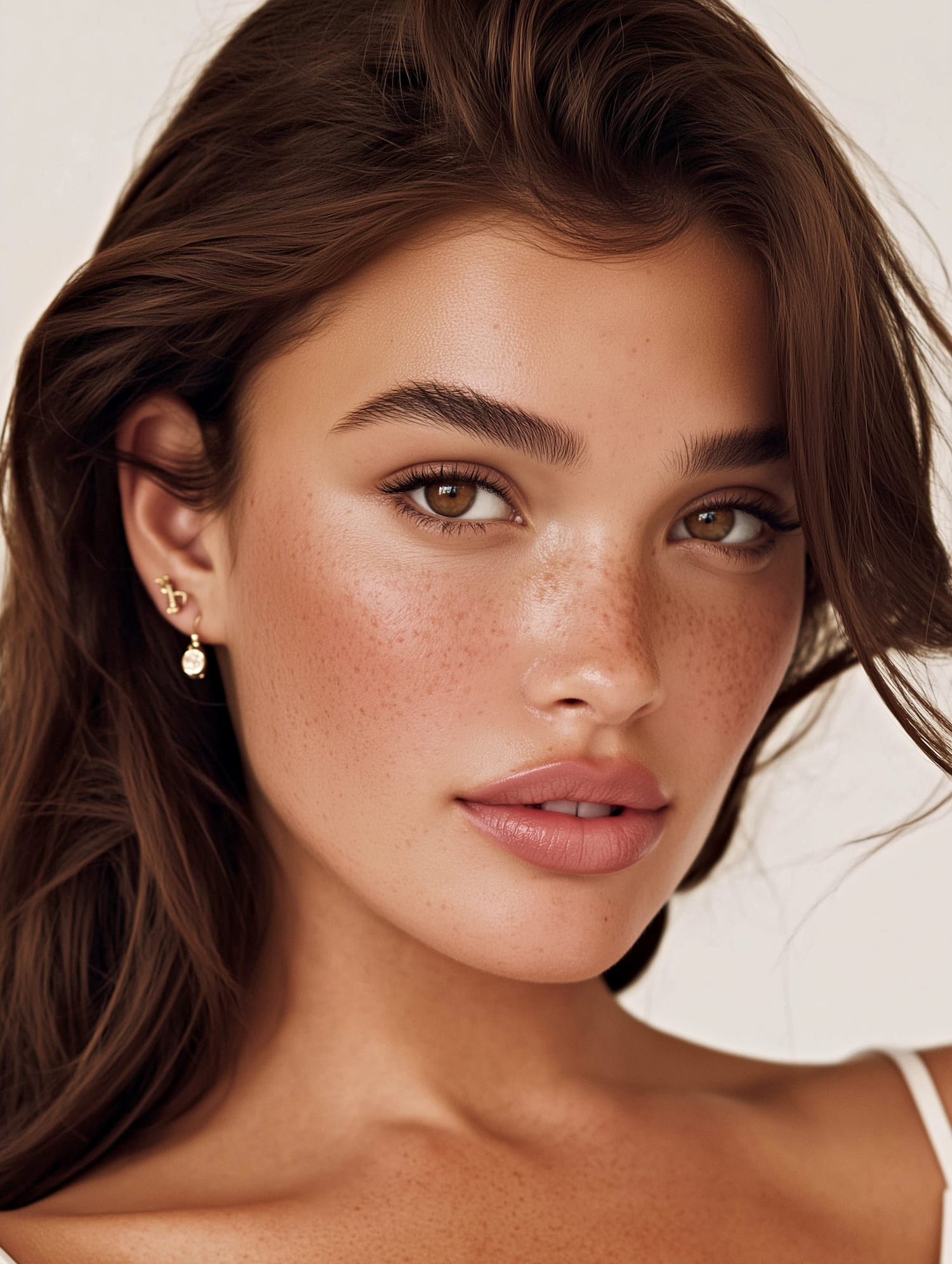 Close-up portrait of a young woman with freckled skin, hazel eyes, and brown hair, wearing subtle makeup and elegant earrings.