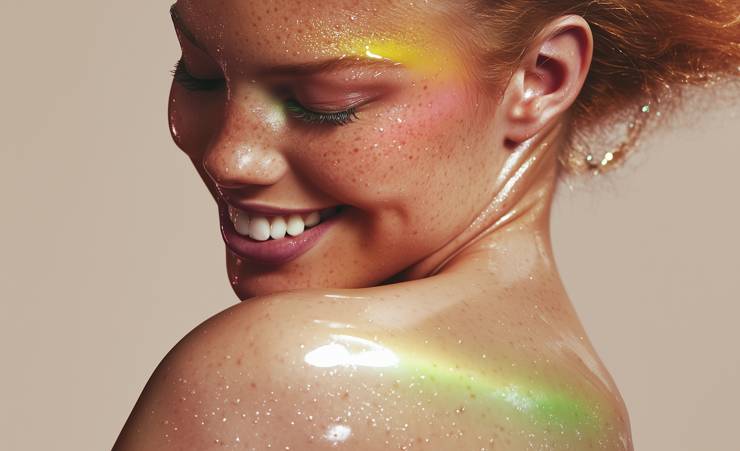 Close-up of a smiling person with freckles, vibrant makeup, and glossy skin, highlighting natural beauty and artistic expression.