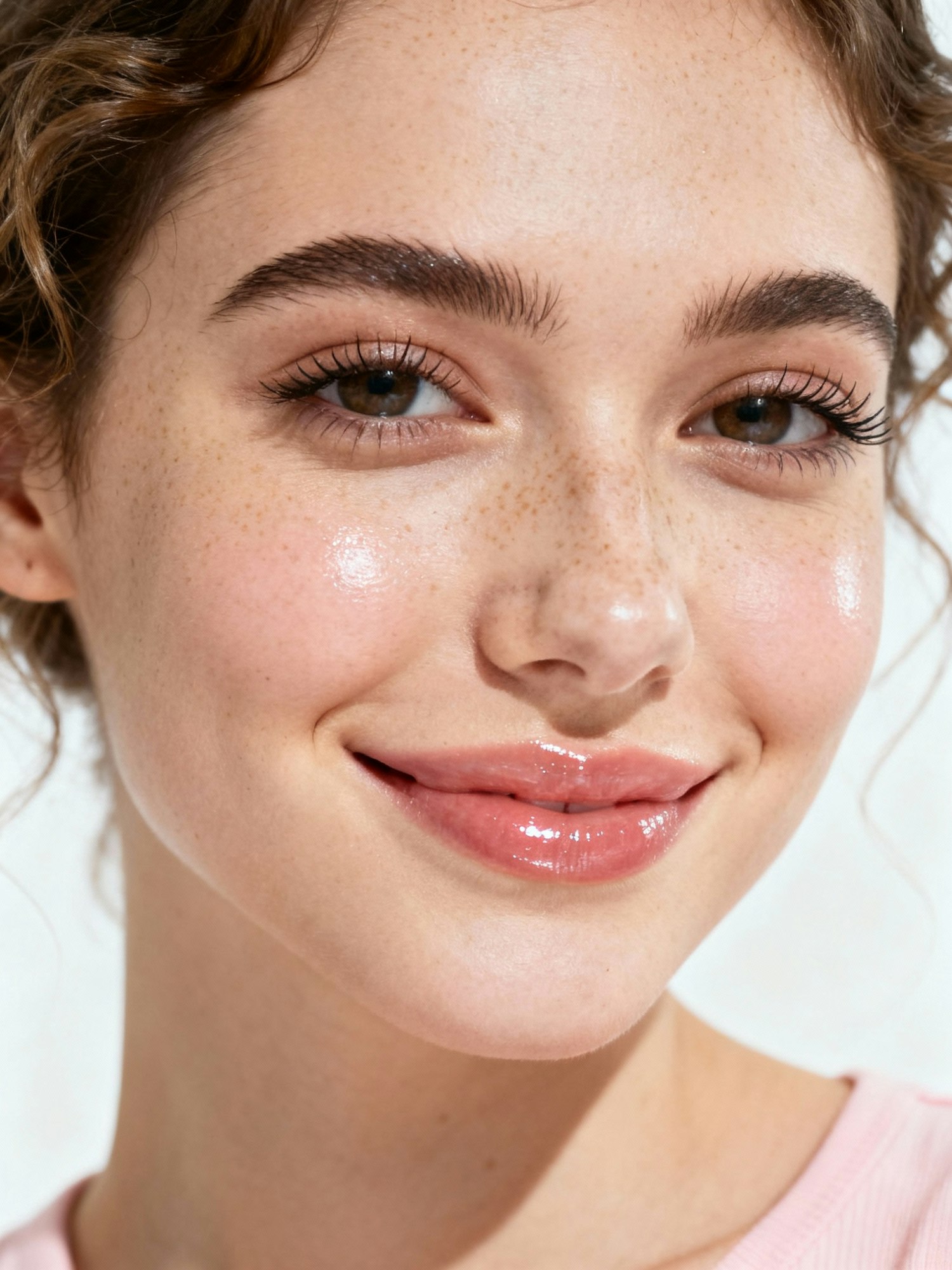 Close-up of a young woman with glowing skin, freckles, and glossy lips, highlighting her natural beauty and radiant complexion.