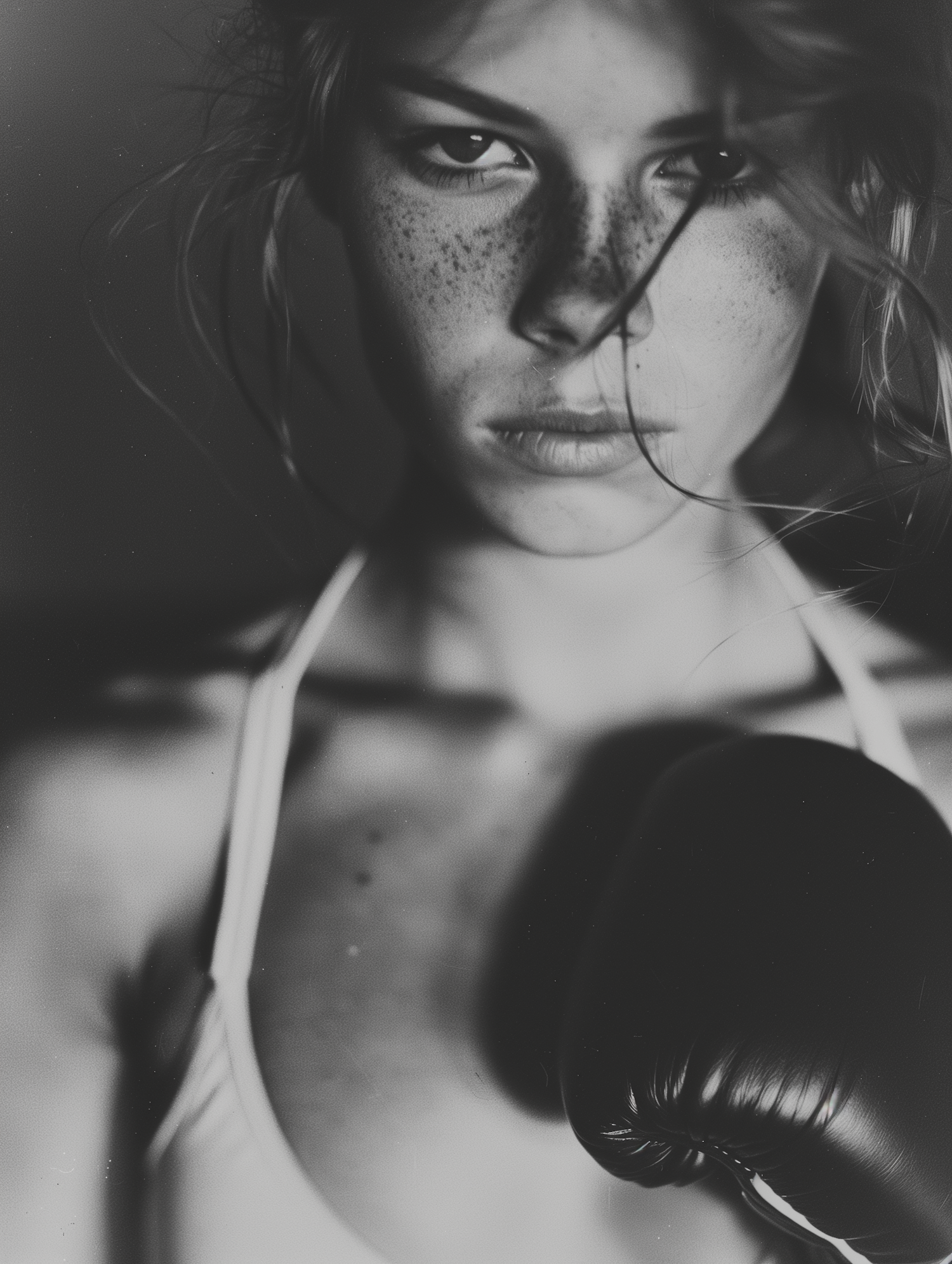 Black-and-white portrait of a freckled woman with a boxing glove, intense gaze, and dramatic lighting emphasizing determination.