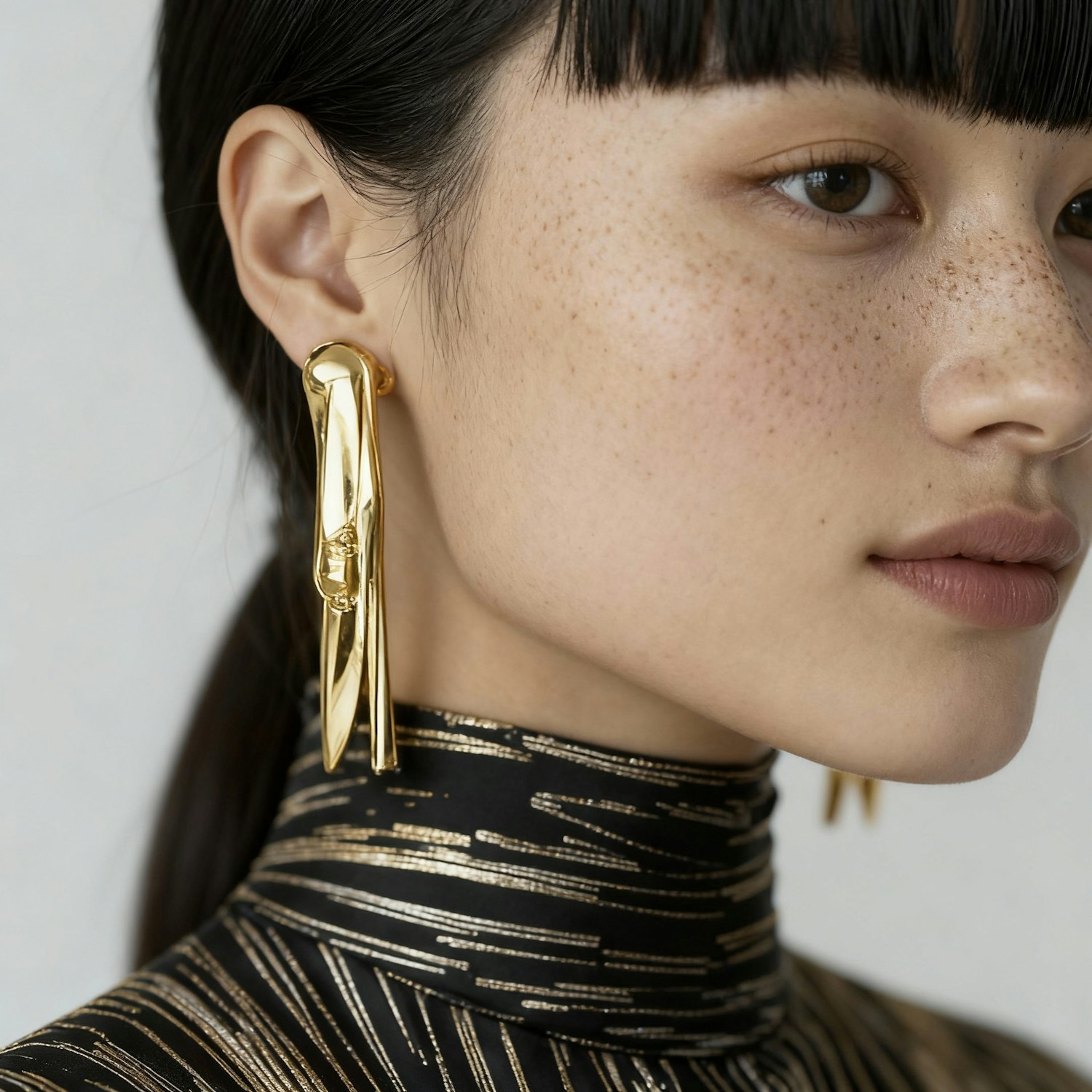 Close-up of a person with freckles, wearing gold earrings and a black patterned top, showcasing a modern and elegant style.