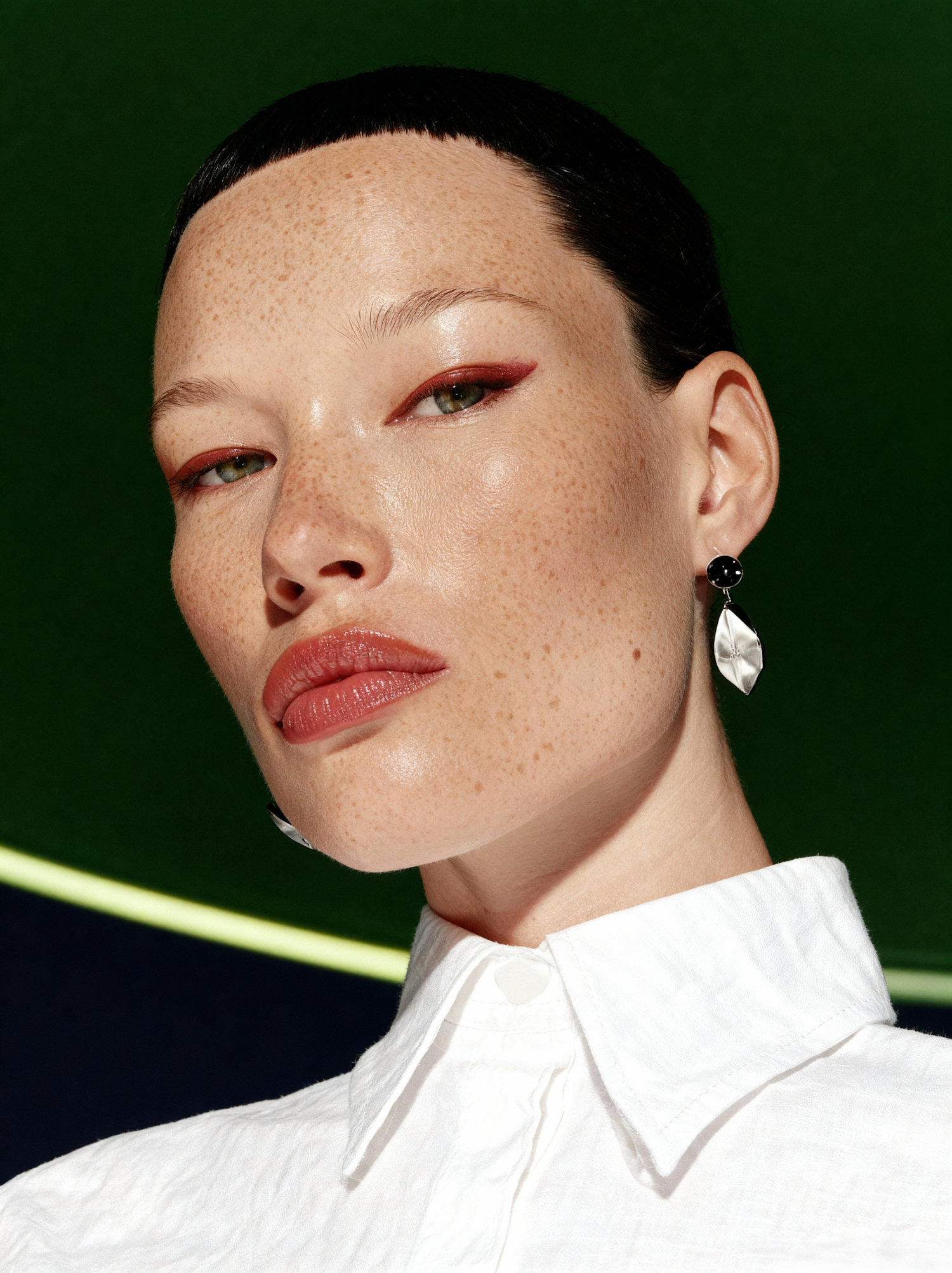 Close-up of a person with freckles, bold red eyeliner, and metallic earrings, set against a green background.