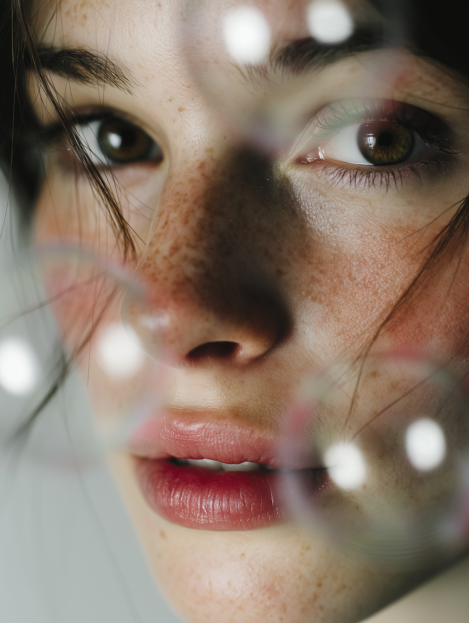 Close-up of a freckled face with brown eyes and pink lips, framed by soft light reflections, creating an artistic and intimate feel.
