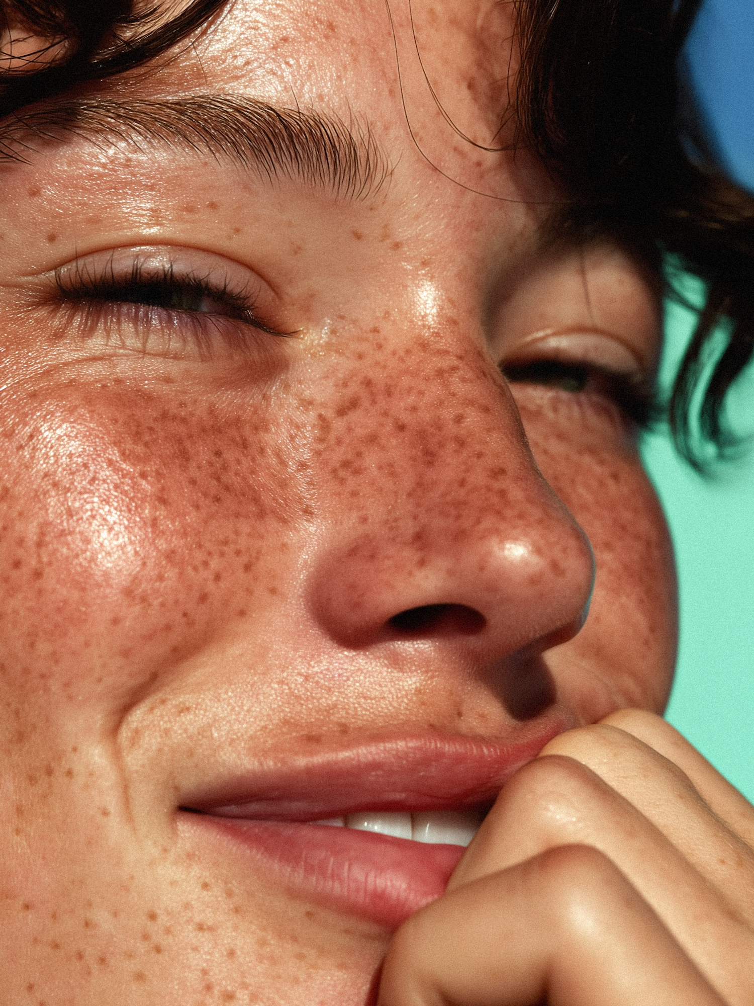 A close-up photo of a person's freckled skin, captured in bright light with vibrant background hues, showing natural beauty.