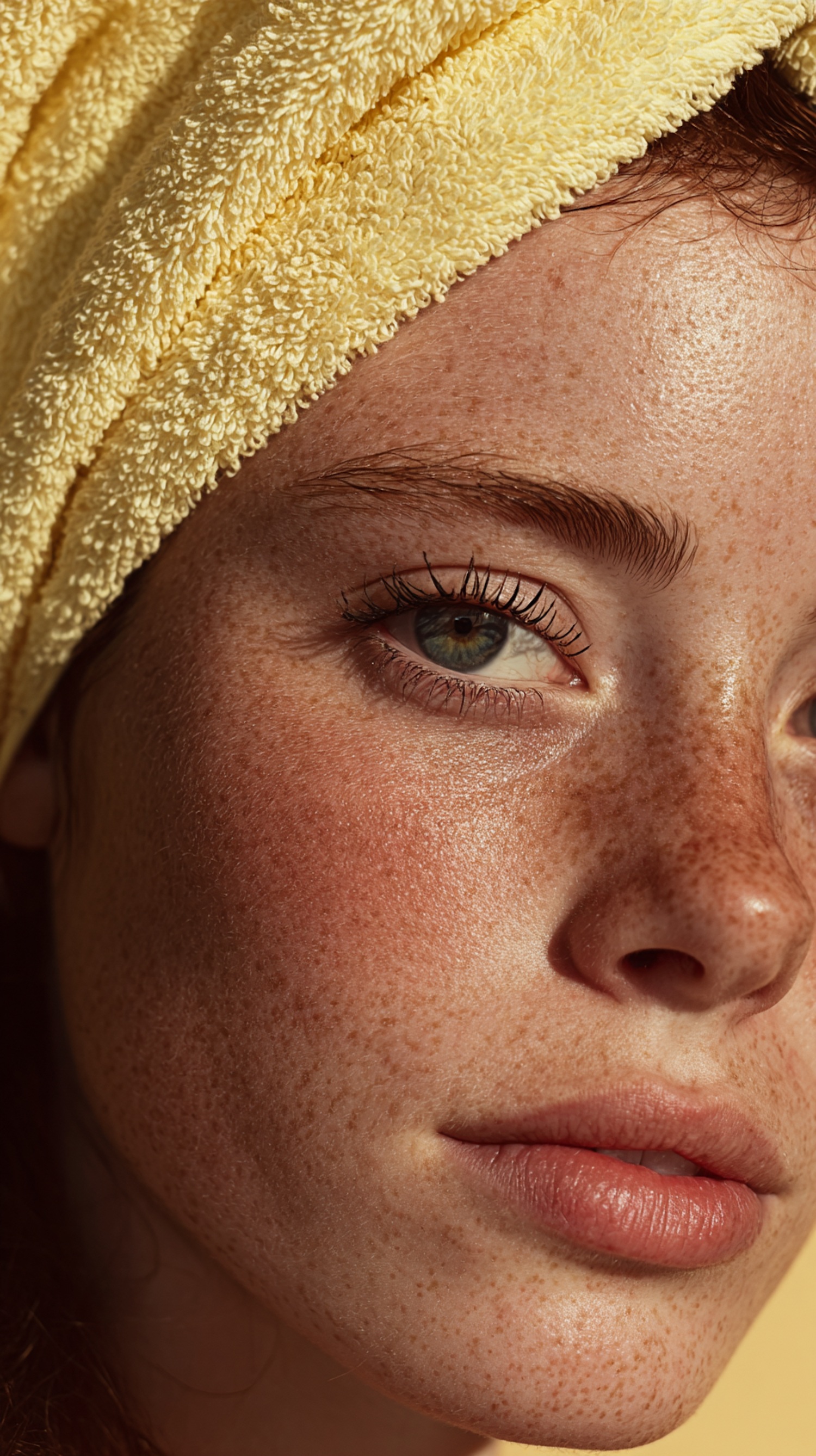 Close-up of a freckled face with green eyes and a yellow towel wrapped around the head, showcasing natural beauty and warm tones.