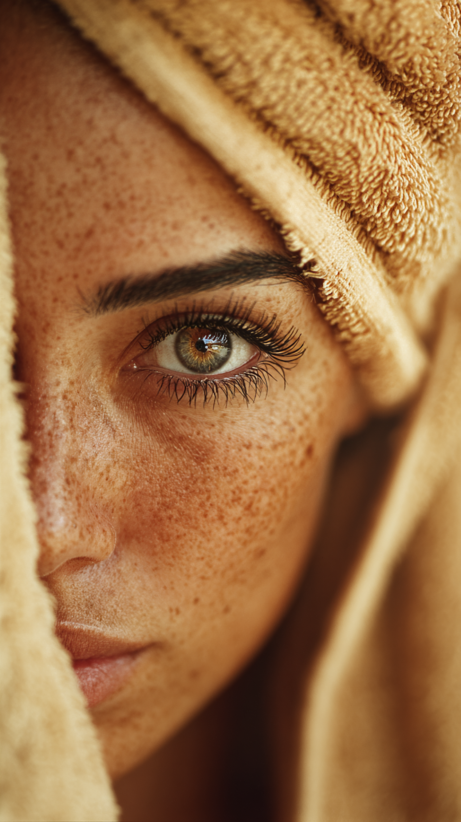 Close-up of a freckled face with a greenish-brown eye, wrapped in a beige towel, showcasing natural beauty and soft textures.