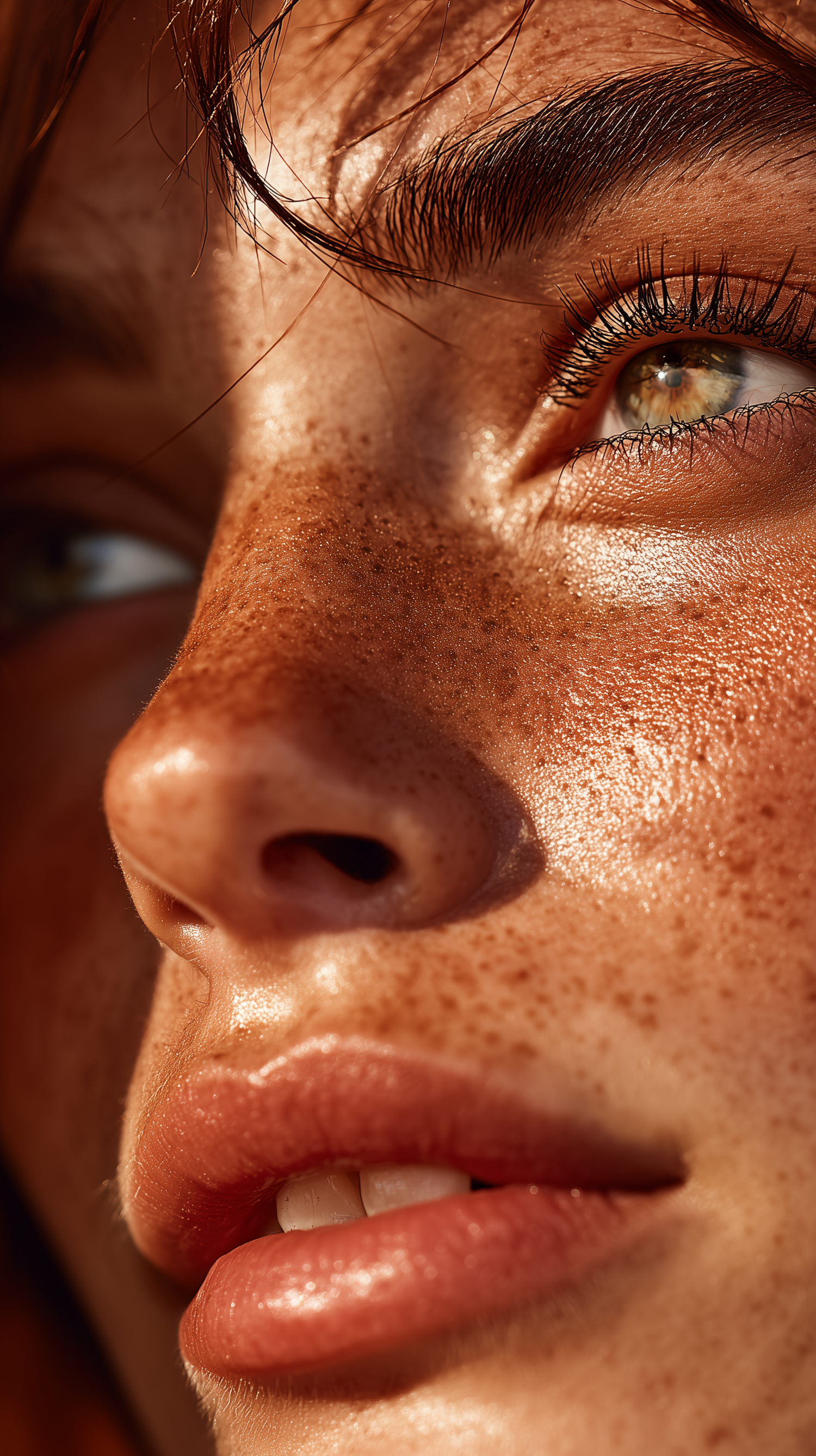 Close-up of a freckled face with green eyes and full lips, beautifully lit to highlight natural textures and details.