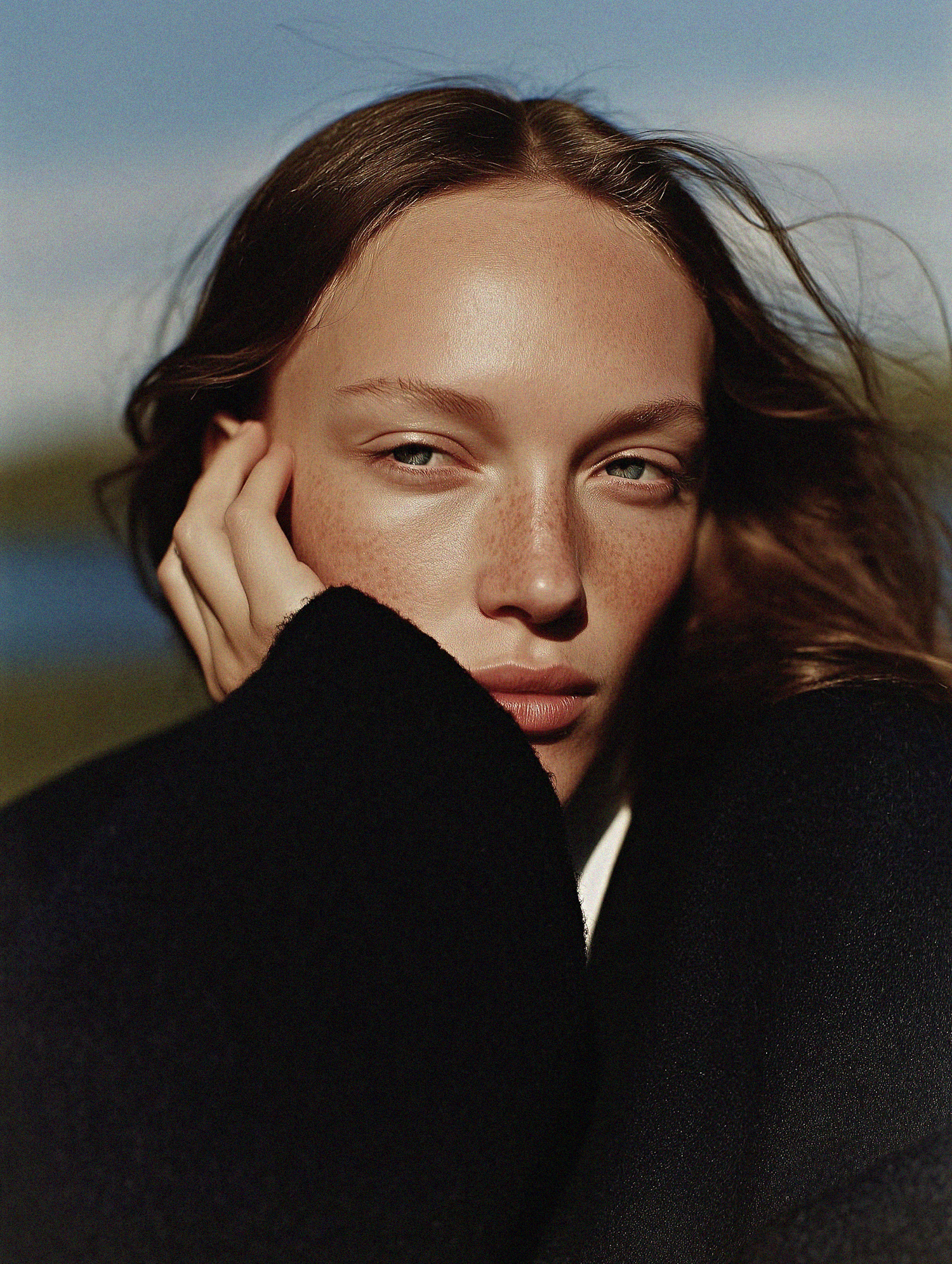 Close-up portrait of a freckled face partially covered by dark clothing, set against a blurred natural background.