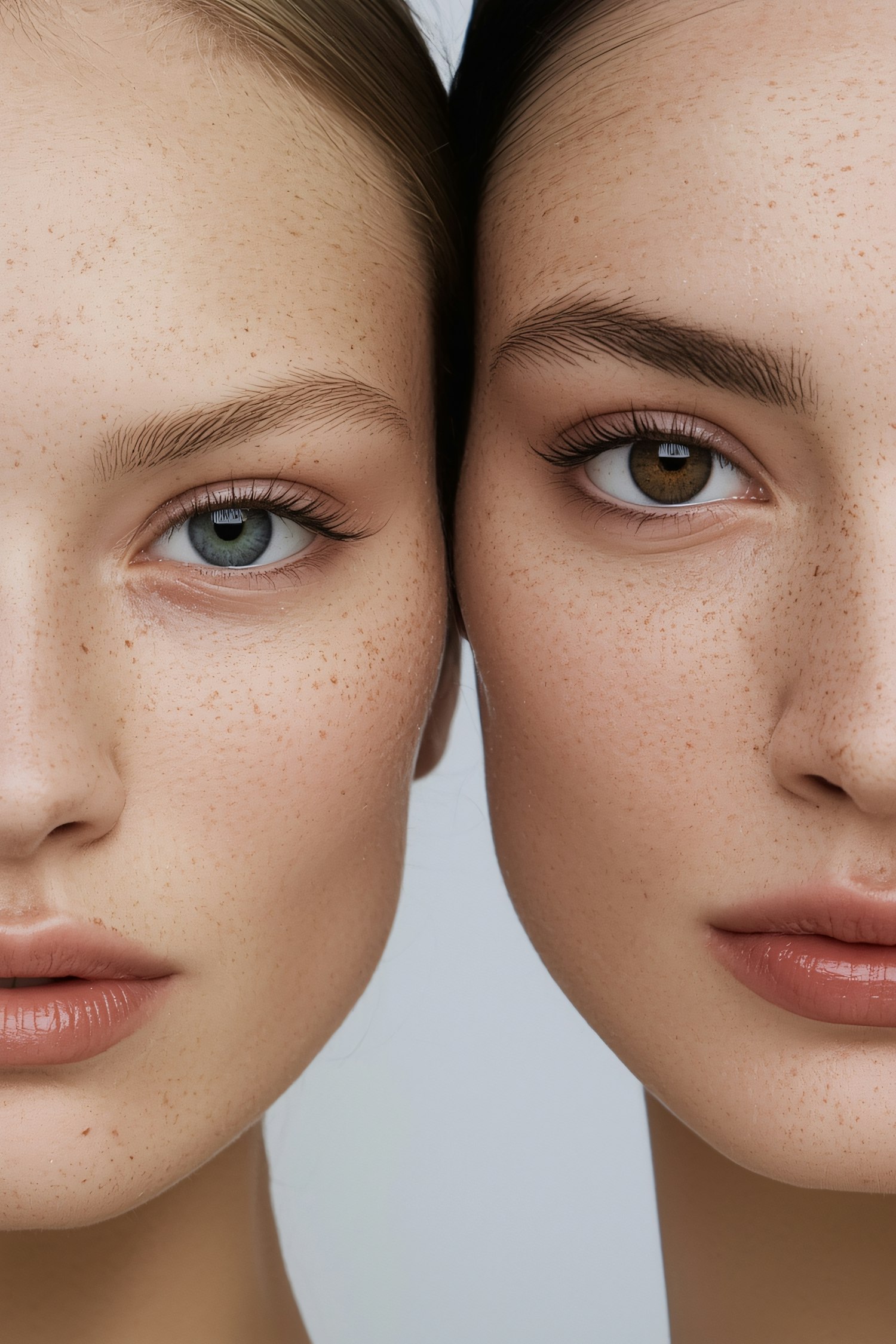 Close-up of two freckled faces with contrasting eye colors, showcasing natural beauty and symmetry in a minimalistic setting.