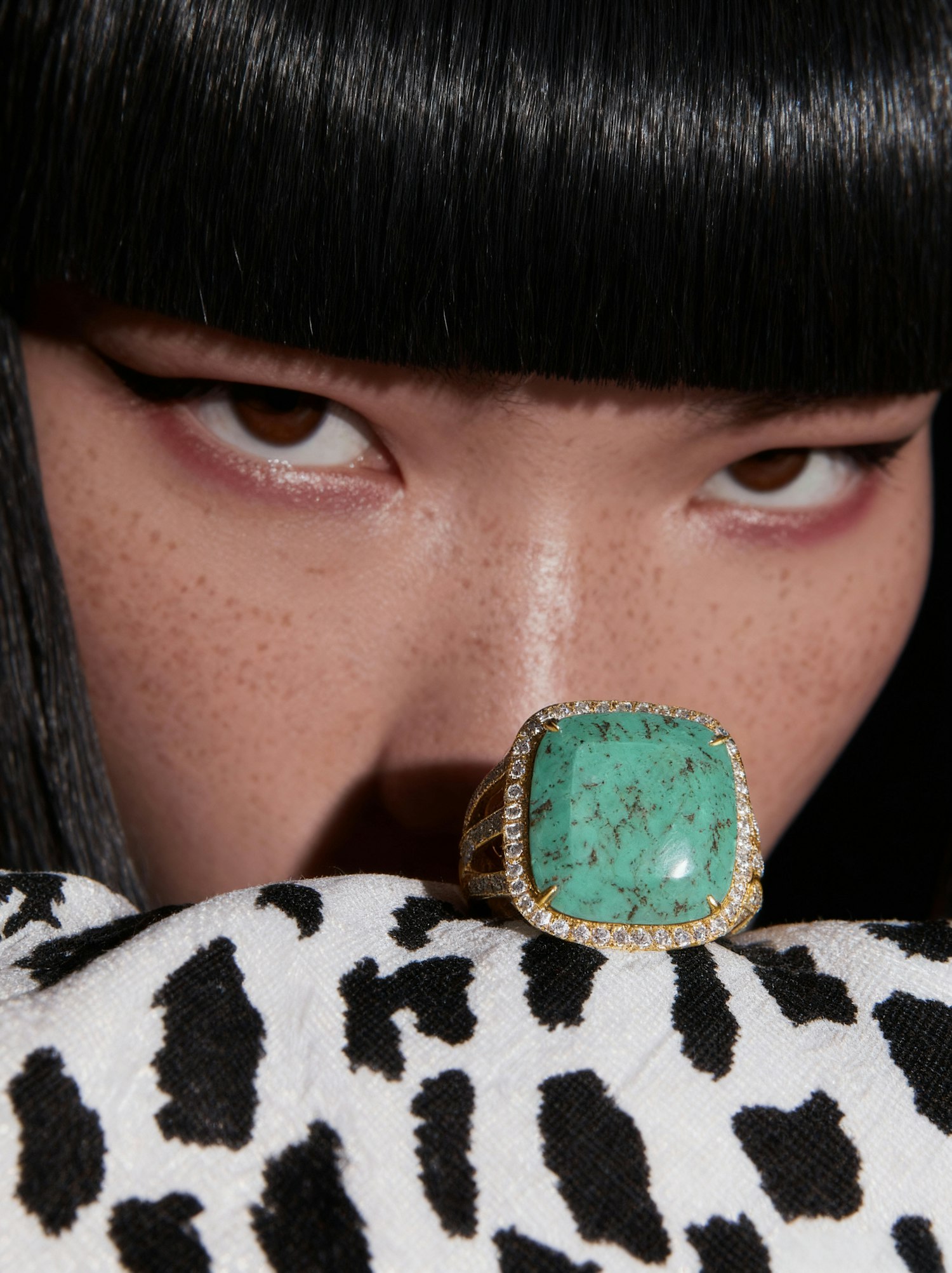 Close-up of a turquoise gemstone ring on animal print fabric, with a freckled face and intense gaze in the background.
