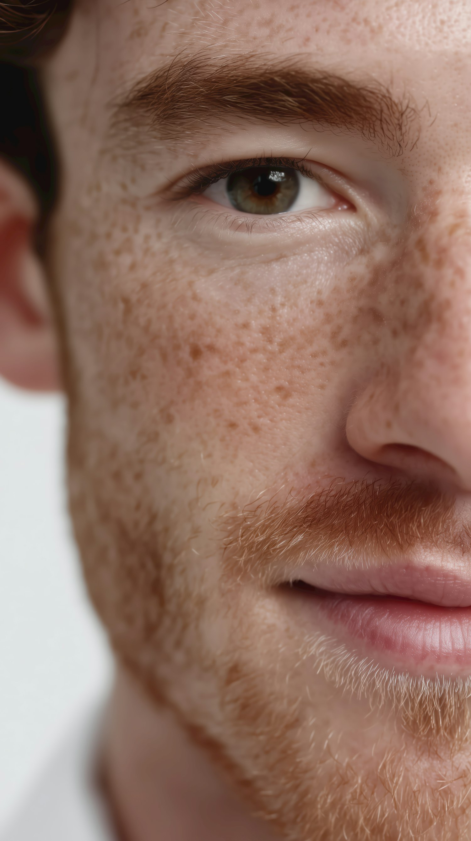 Close-up of a freckled face with hazel eyes, ginger facial hair, and detailed skin texture against a neutral white background.