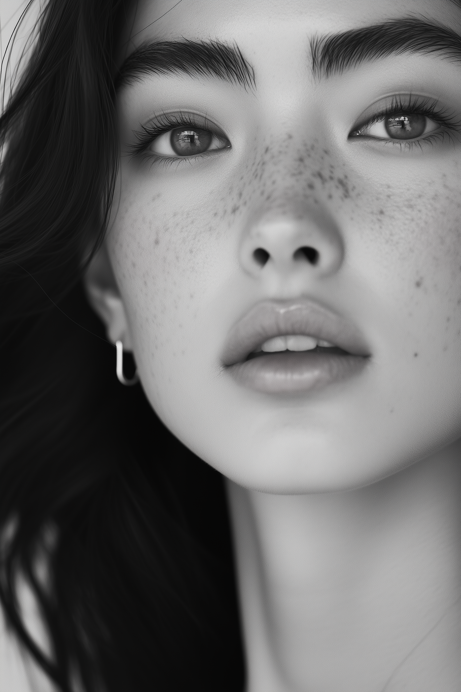 Black-and-white close-up of a freckled woman with wavy hair, thick brows, and a hoop earring, gazing directly at the camera.
