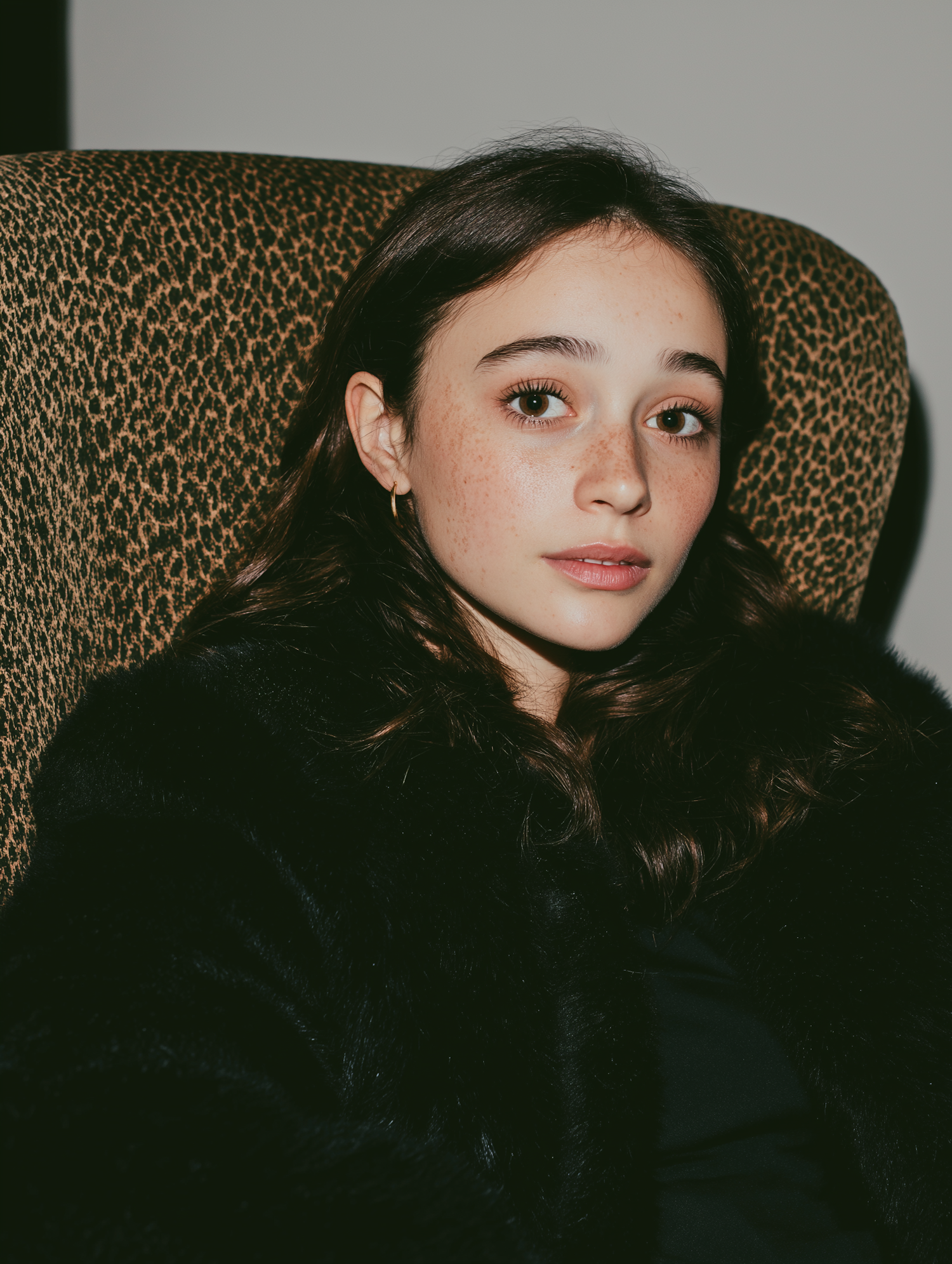 A young person with freckles and dark hair sits on a leopard-print chair, wearing a black coat, with a neutral expression.