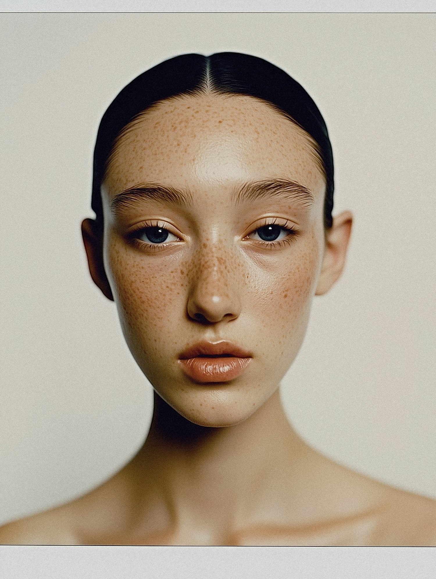 Close-up of a freckled woman with light blue eyes, sleek dark hair, and natural makeup against a neutral background.