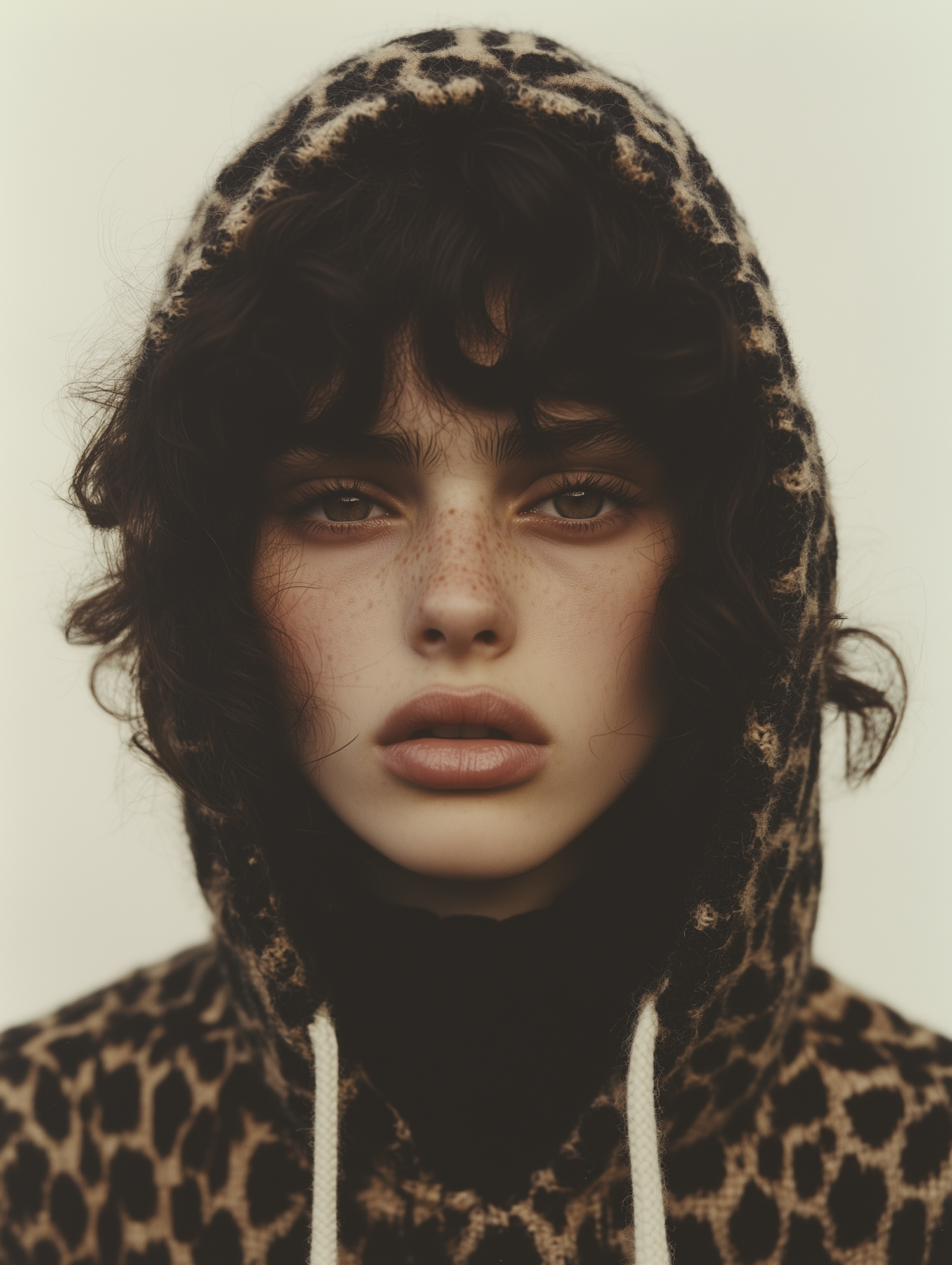 Close-up of a person in a leopard-print hoodie, showcasing freckles, curly hair, and hazel eyes with a neutral expression.
