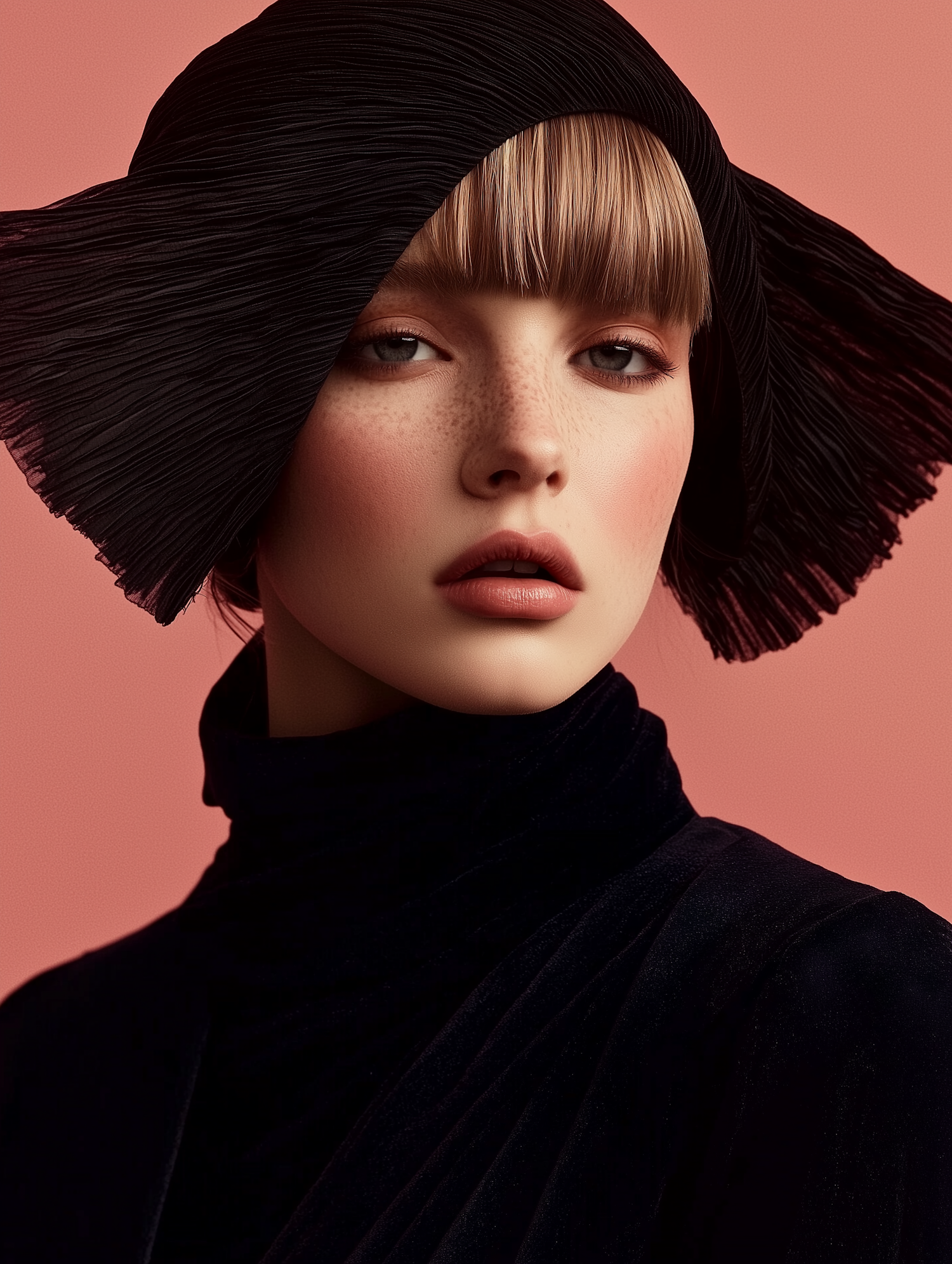 Elegant portrait of a freckled woman in a black pleated headpiece, set against a pink background. Soft lighting highlights her serene expression.