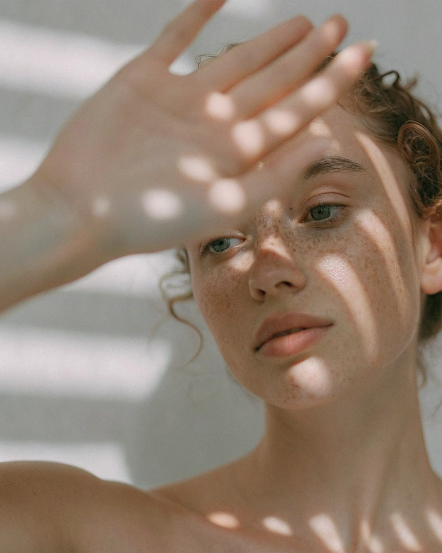 A serene close-up of a freckled woman with sunlight casting dappled shadows on her face, creating a soft and natural aesthetic.