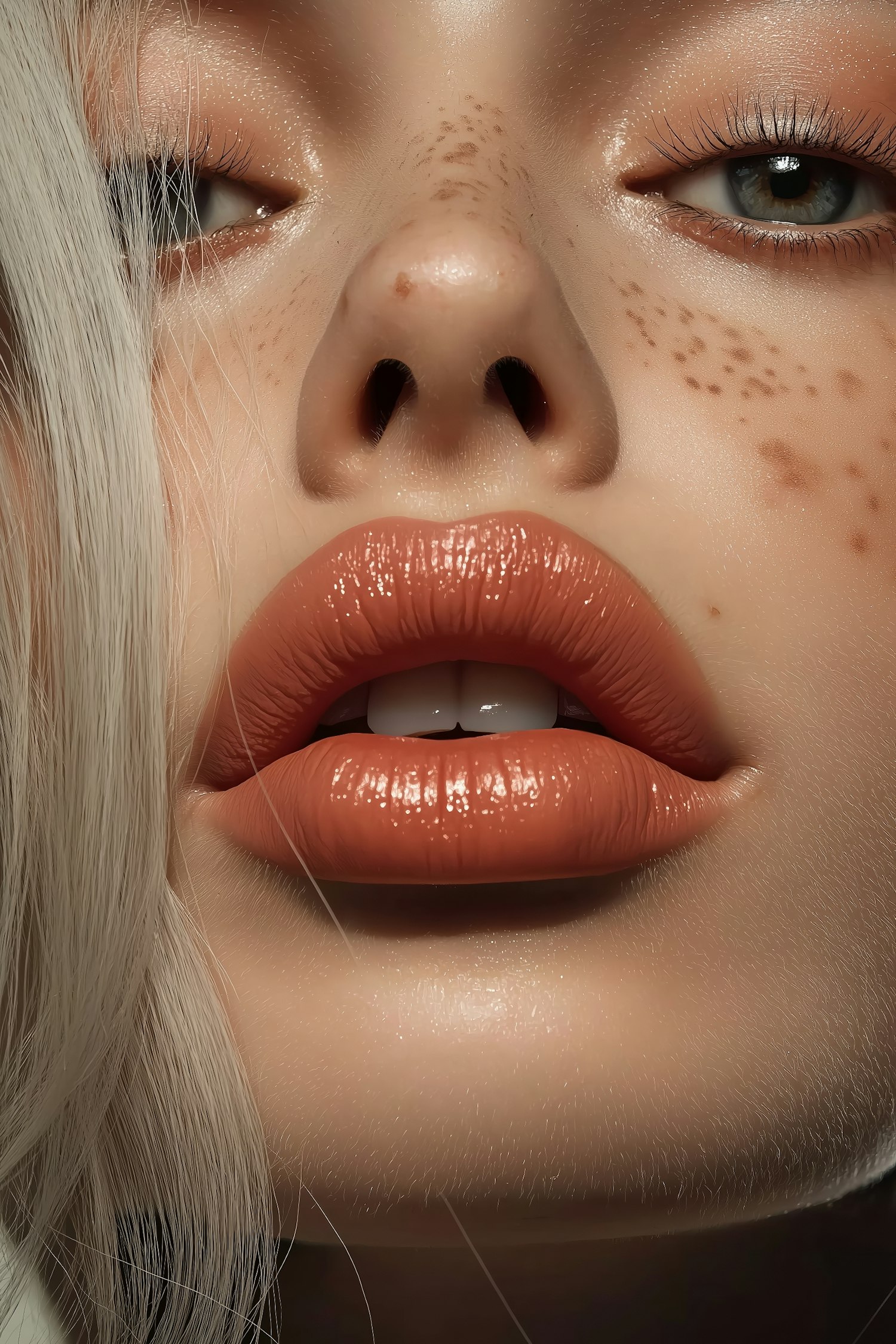 Close-up of a face highlighting glossy orange lips, freckles, and shimmering eyes, with light-colored hair framing the composition.
